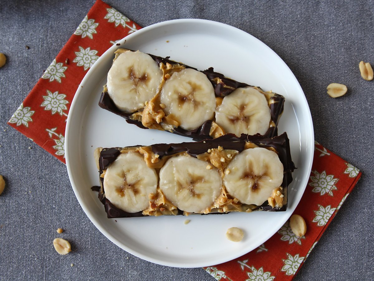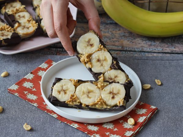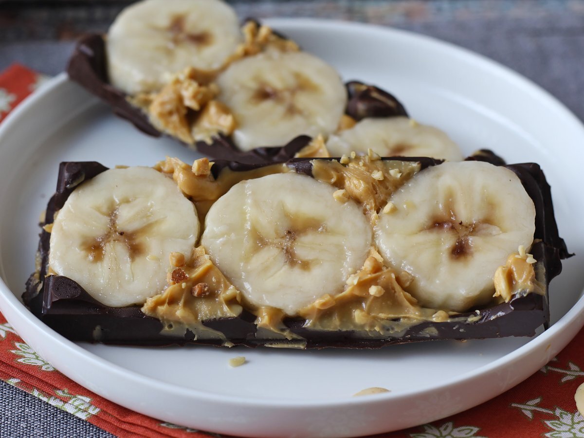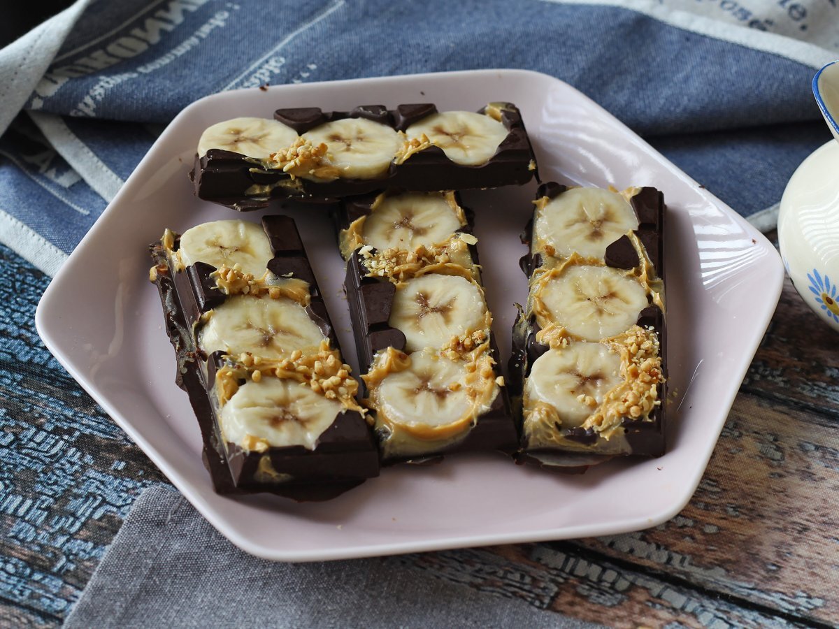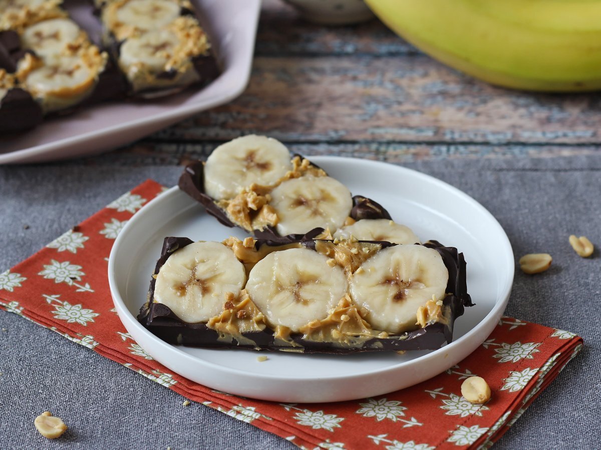 Mini tabletas de chocolate, plátano y crema de cacahuete: un bocado dulce sin azúcar añadido