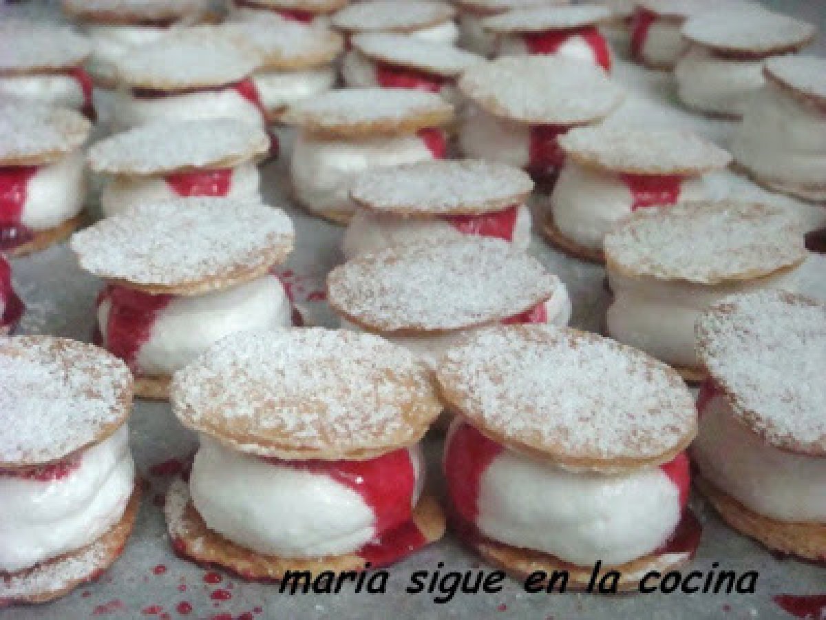 Minis milhojas de merengue italiano y fresa AnteriorSiguiente PostreFácil40 min227 Kcal Enviar esta receta a un amigo Imprimir esta página Preguntar al autor Publicar la foto de esta receta Ingredientes 6 una placa de hojaldre merengue italiano (casero o comprado) sirope de fresa azúcar glass Costo estimado: 1.27Euros€ (0.21€/porción)