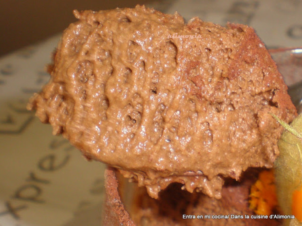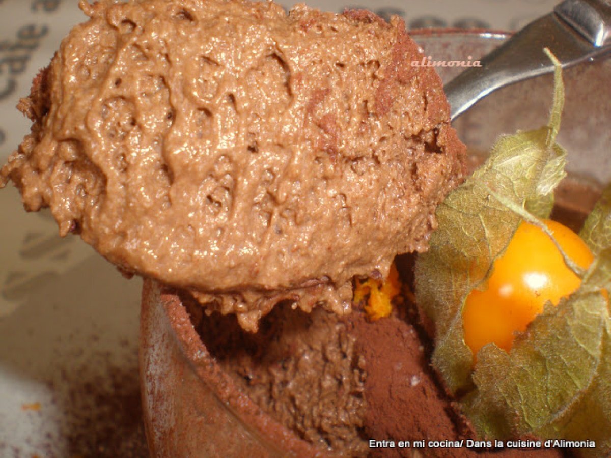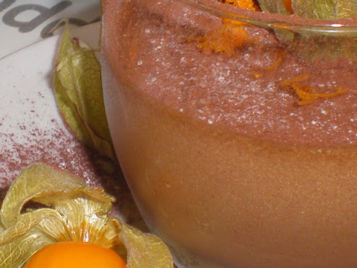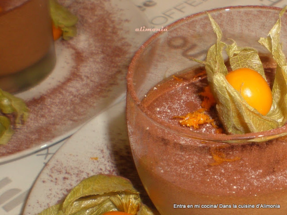 Mousse de chocolate-naranja-physalis / mousse au chocolat-orange-physalis AnteriorSiguiente PostreFácil30 min Enviar esta receta a un amigo Imprimir esta página Preguntar al autor Publicar la foto de esta receta Ingredientes 2 200 g de chocolate negro a 75% de cacao. 1 naranja. 6 huevos. 1 pizca de sal. 3/4 physalis por persona. cacao amargo en polvo.