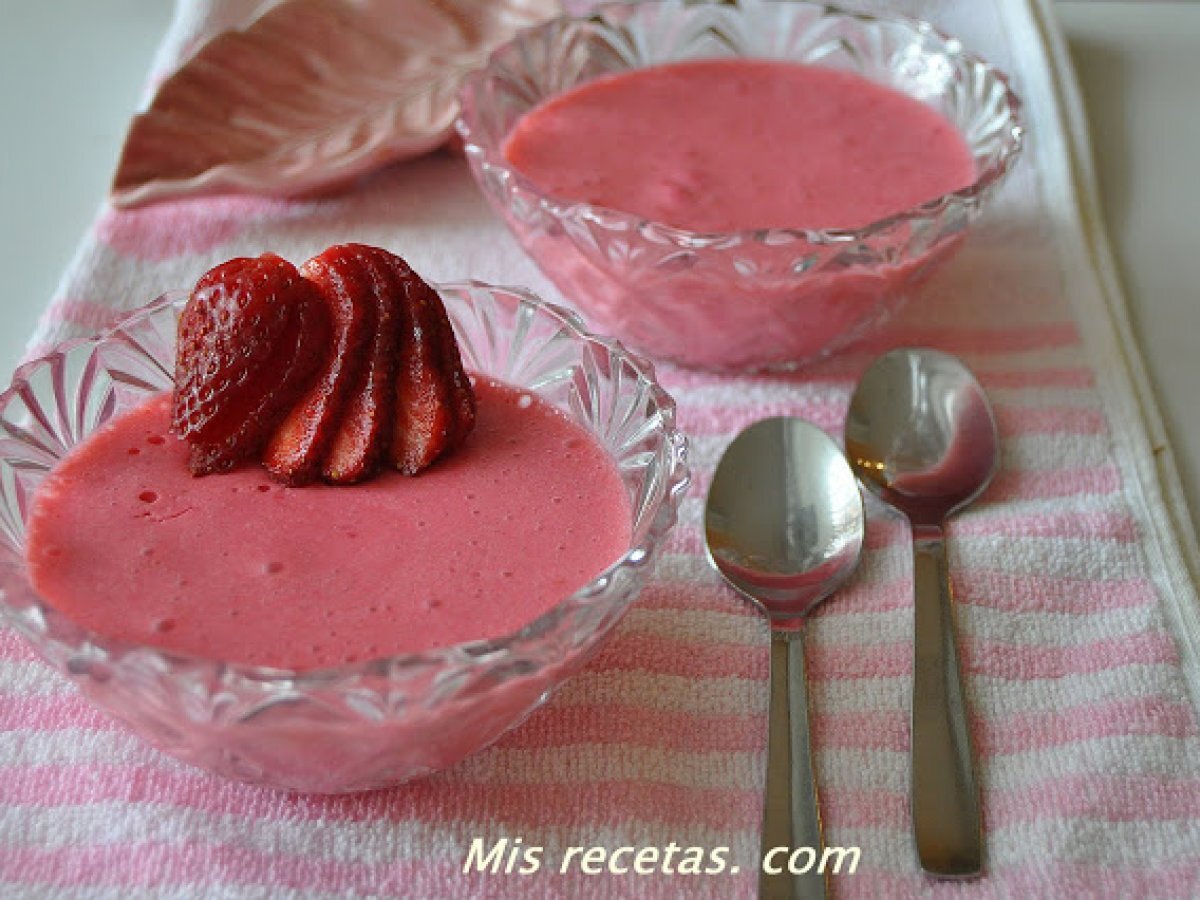 Mousse de fresas fácil y rápida AnteriorSiguiente PostreFácil20 min94 Kcal Enviar esta receta a un amigo Imprimir esta página Preguntar al autor Publicar la foto de esta receta Ingredientes 2 1 sobre de gelatina de fresa 1 yogur griego azucarado 200 g de fresas aproximadamente 1 vaso de agua algunas fresas más para adornar azúcar glasé Costo estimado: 2.33Euros€ (1.16€/porción)