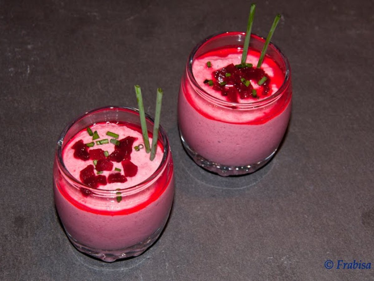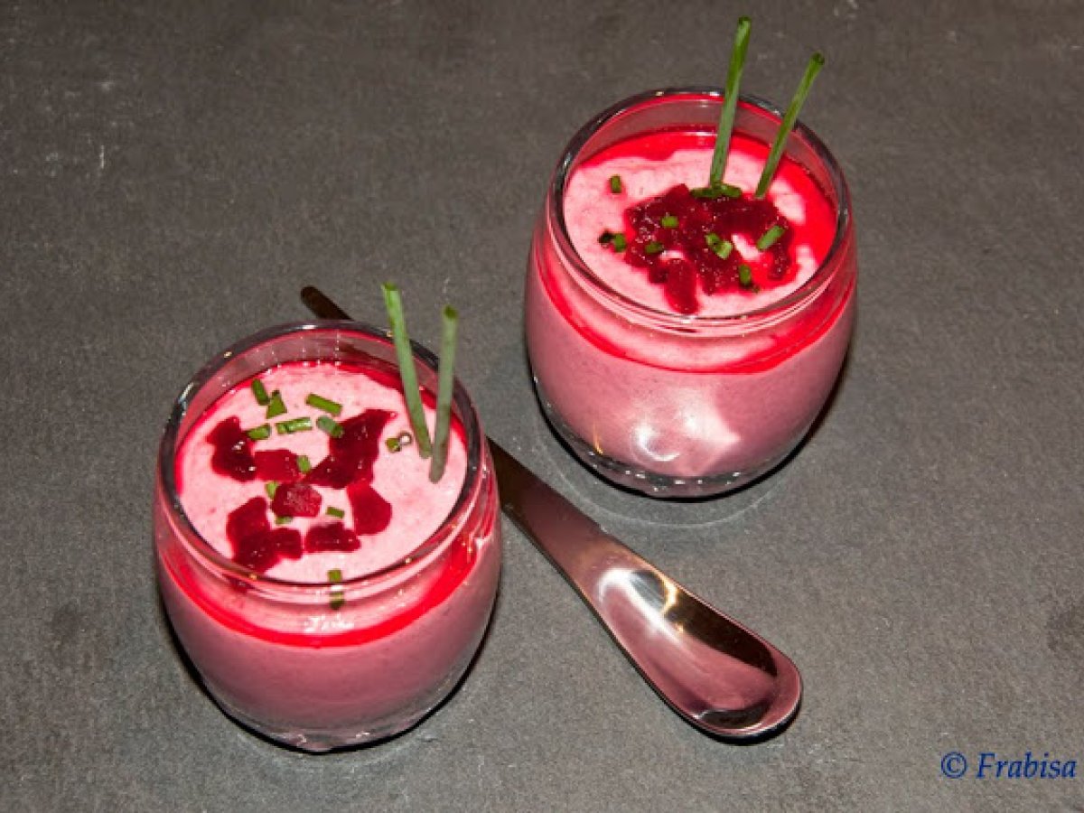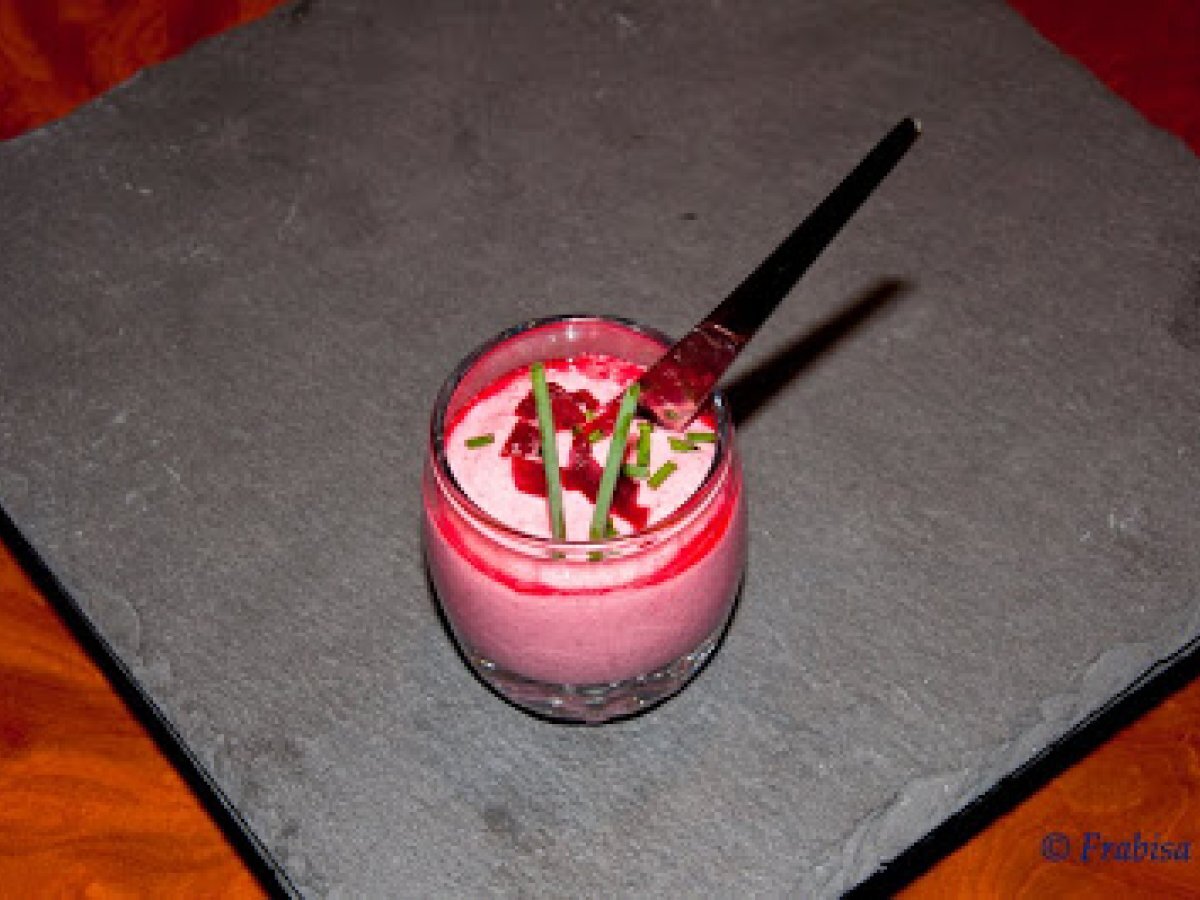 Mousse de queso y remolacha vota ahora AnteriorSiguiente PostreFácil25 min56 Kcal Enviar esta receta a un amigo Imprimir esta página Preguntar al autor Publicar la foto de esta receta Ingredientes 2 2 tarrinas de queso con ajo y perejil Remolacha en rodajas 1 clara de huevo. Cebollino para decorar.