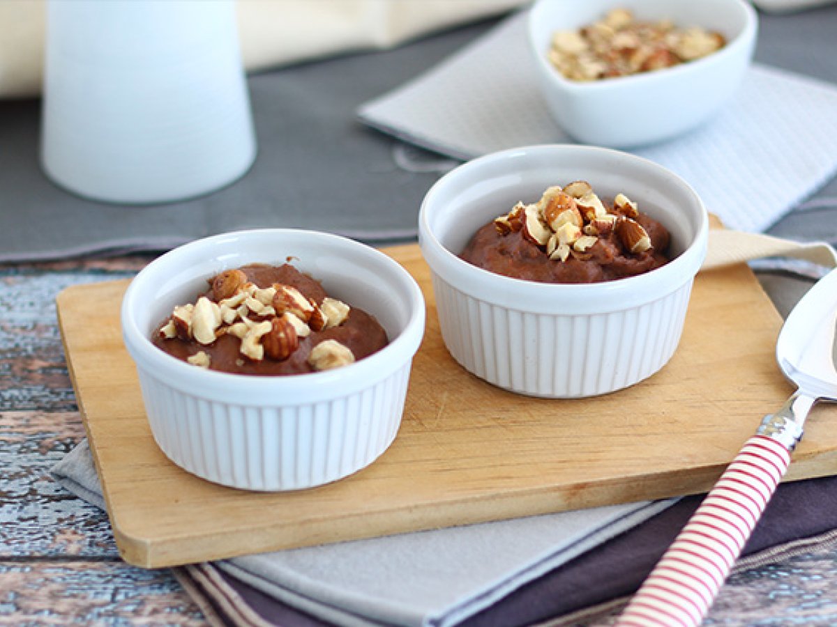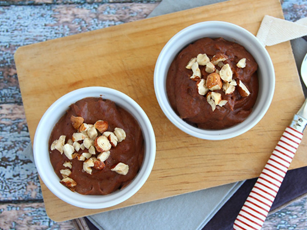 Vierte la preparación en recipientes individuales. Esparcir las avellanas en trozos y refrigera al menos 1 hora.
