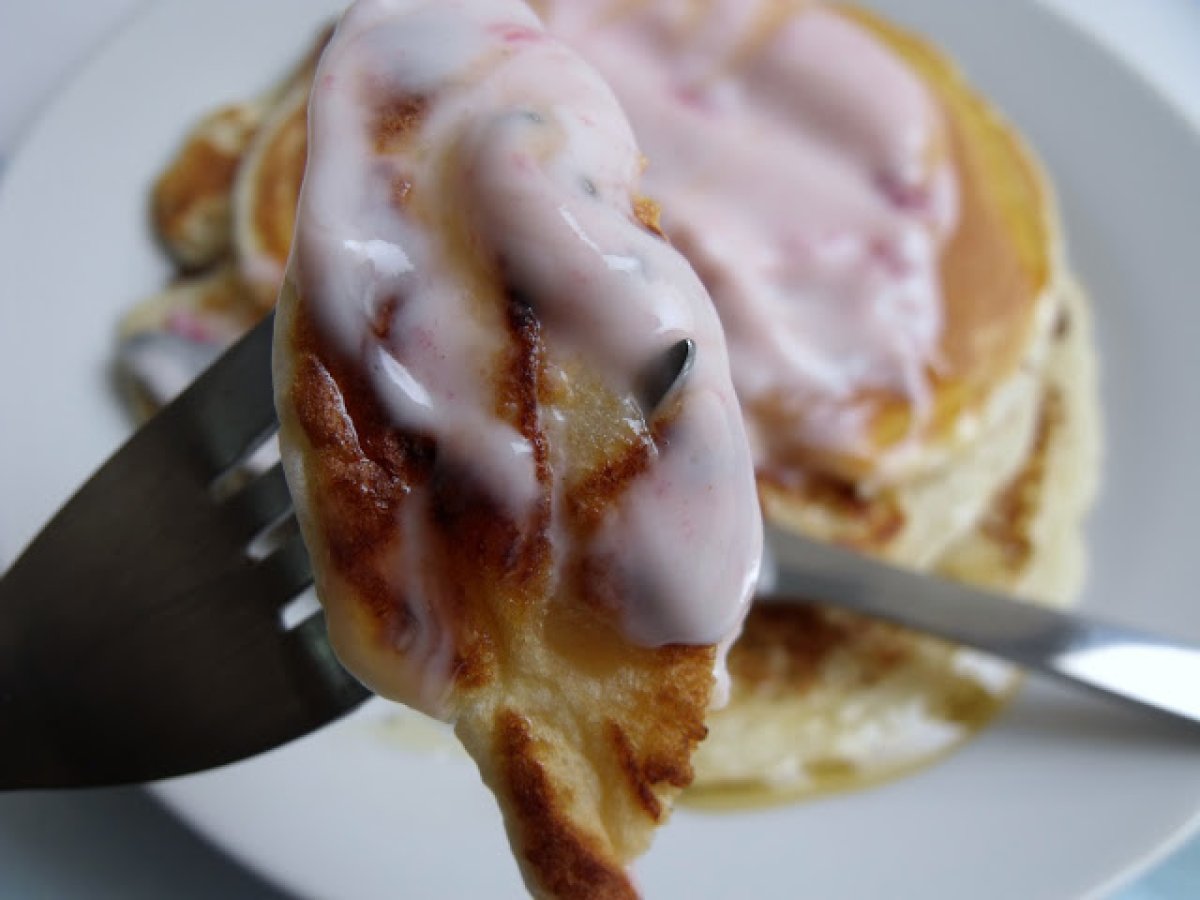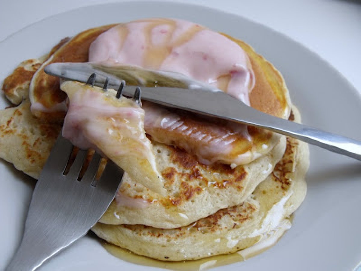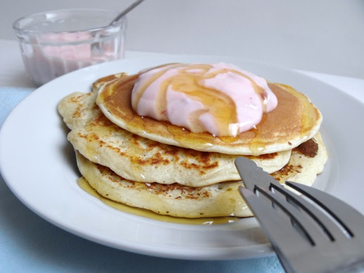 Pancakes con yogurt de fresa y miel AnteriorSiguiente PostreFácil15 min Enviar esta receta a un amigo Imprimir esta página Preguntar al autor Publicar la foto de esta receta Ingredientes 2 Un huevo Una taza de leche La mitad de una taza de harina con levadura, Un paquete de levadura al municipio. Algunos margarina. Yogur Miel