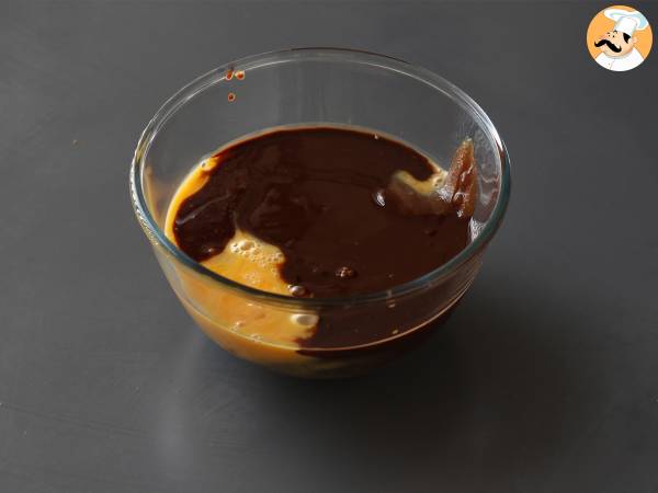 Verter la crema de castañas en un bol y seguidamente añadir los huevos. Derretir la mantequilla y el chocolate. Verter en el bol.