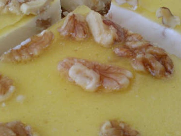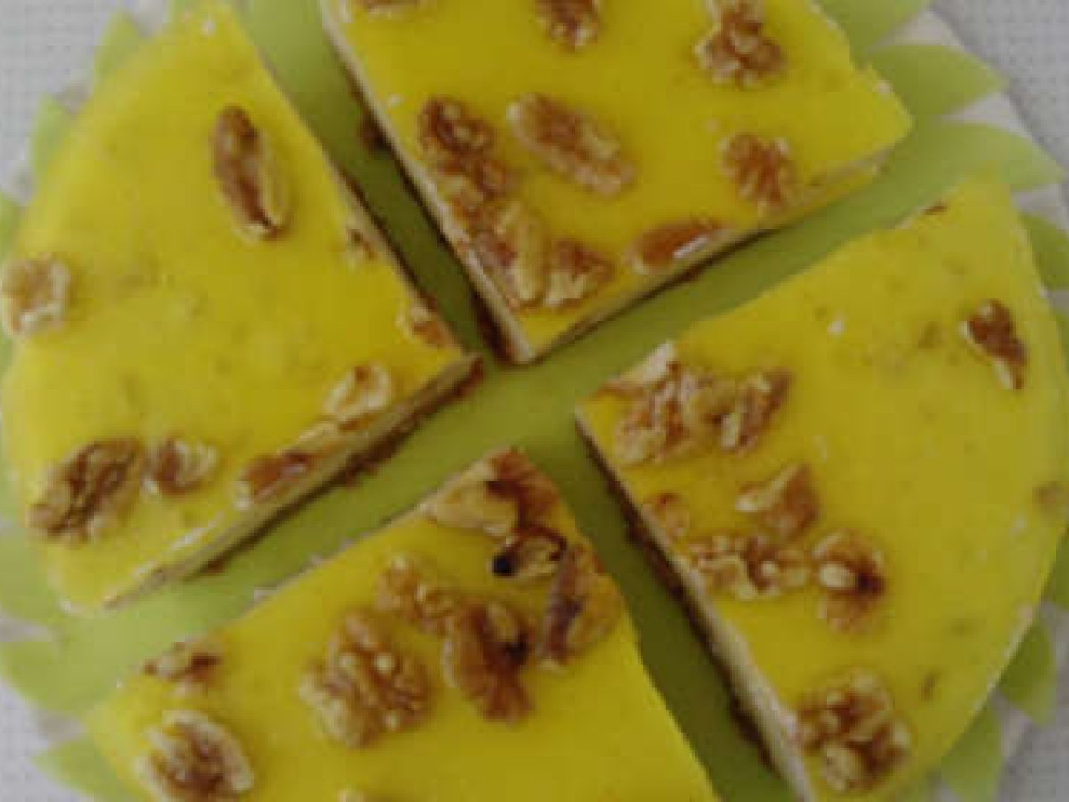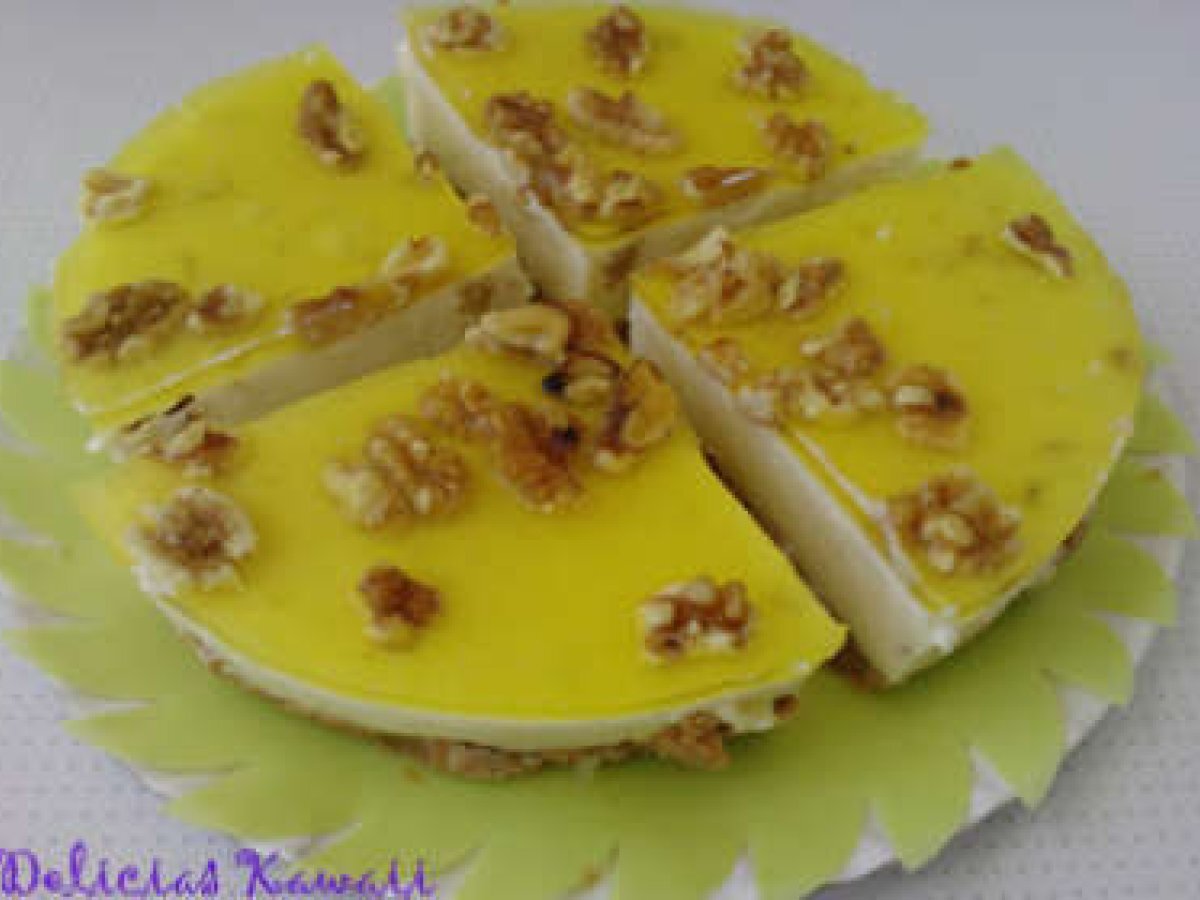 Pastel de cuajada cítrica AnteriorSiguiente PostreMedio1 h 30 m Enviar esta receta a un amigo Imprimir esta página Preguntar al autor Publicar la foto de esta receta Ingredientes 8 Base de galletas: 1 paquete de galletas 150 gr. de mantequilla Cuajada: Medio litro de nata liquida 2 ó 3 sobres de cuajada. 1 vaso de azúcar 1 vaso de leche Un puñado de nueces en trocitos Decoración: Dos o tres hojas de gelatina neutra Colorante amarillo Aroma de limón Un puñado de nueces (la decoración se puede sustituir por gelatina de limón)