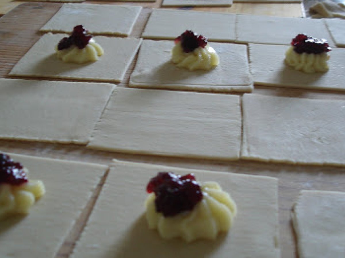 Pastelitos de crema pastelera y mermelada de cerezas AnteriorSiguiente PostreMedio1 h 30 m Enviar esta receta a un amigo Imprimir esta página Preguntar al autor Publicar la foto de esta receta Este postre lleva algún tiempo, pero el resultado vale la pena. Ingredientes 6 Un paquete de masa para pastelitos (hojaldre en cuadrados) crema pastelera bien espesa dulce de cerezas CREMA PASTELERA: 3 yemas 1 y 1/2 cucharada de almidón de maiz (Maizena) 75 g de azúcar 375 cc. de leche esencia de vainilla 1 cucharada de manteca (15 grs.)