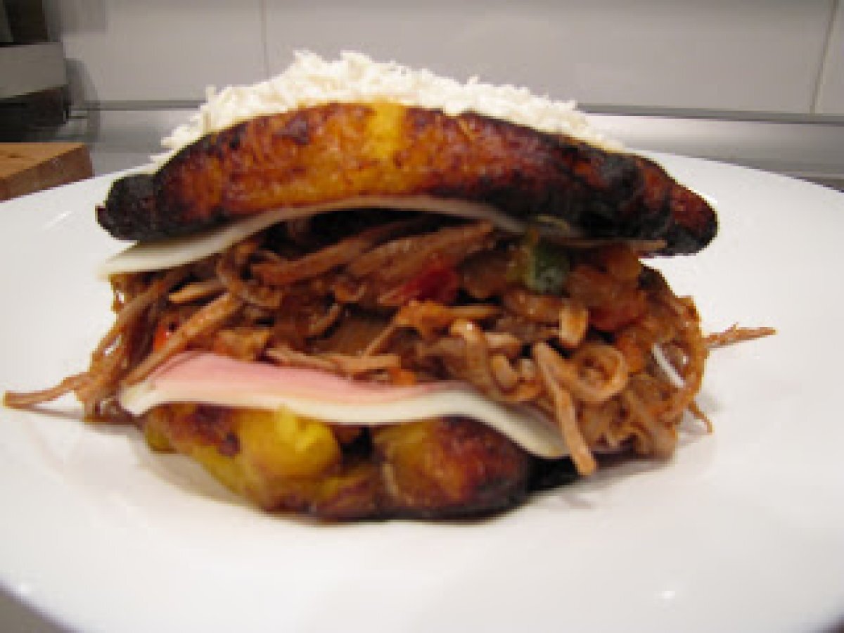 Patacón de maduro/ hamburguesa de platano macho (cocina venezolana) AnteriorSiguiente PostreFácil35 min584 Kcal Enviar esta receta a un amigo Imprimir esta página Preguntar al autor Publicar la foto de esta receta Ingredientes 2 2 plátanos maduros 2 lonchas/lonjas de jamón cocido 2 lonchas/lonjas de queso blanco rebanado 4 cucharadas de queso blanco fresco rallado 4 cucharadas grandes de carne mechada Sal al gusto Aceite de girasol para freír los plátanos Costo estimado: 1.84Euros€ (0.92€/porción)