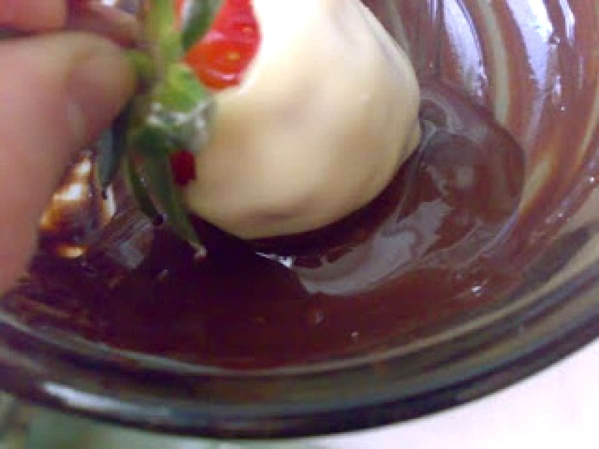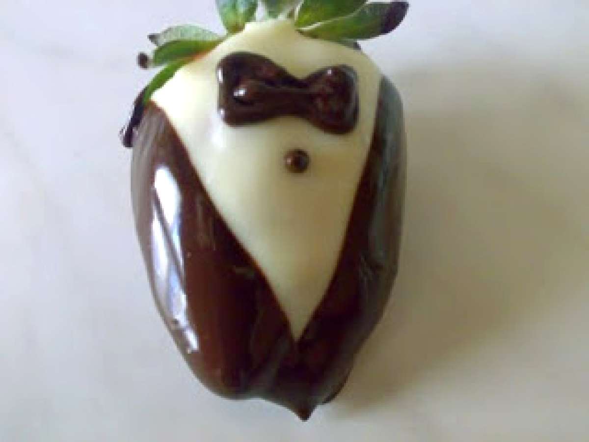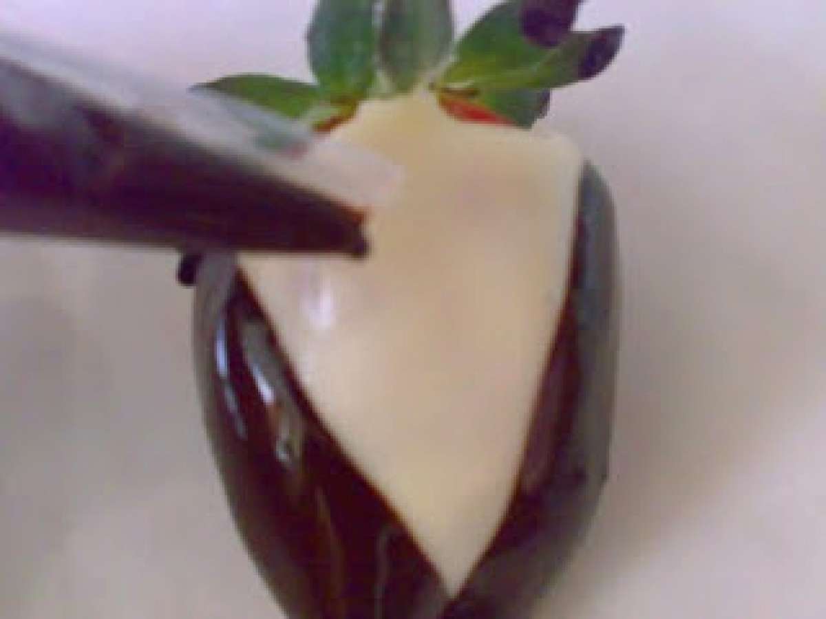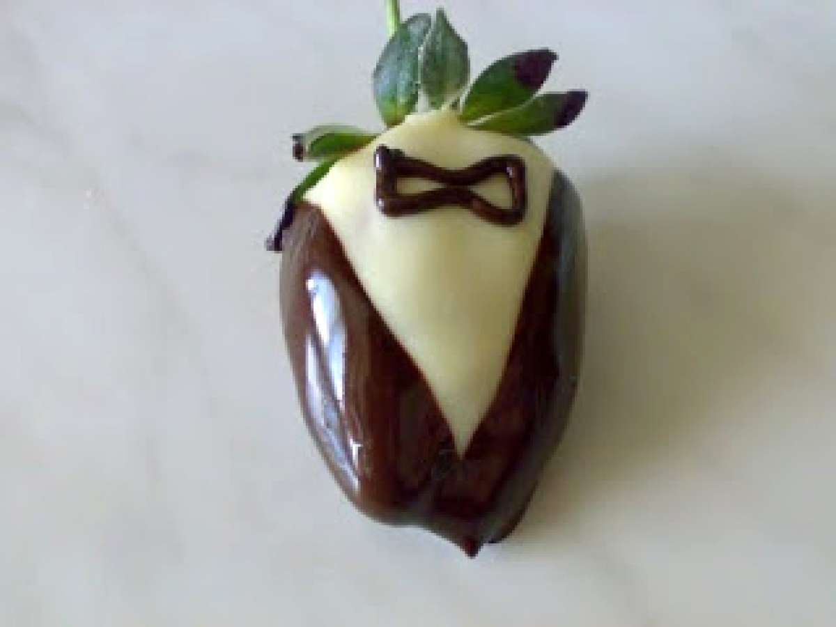 Decoracion de fresas para pastel/torta de novios AnteriorSiguiente PostreFácil15 min Enviar esta receta a un amigo Imprimir esta página Preguntar al autor Publicar la foto de esta receta Ingredientes 1 2 grandes fresas/frutillas frescas La mitad de 1 barra de chocolate negro para postres Nestle 1 cuchararda sopera de crema liquida/nata liquida la mitad de 1 cucharadita pequeña de mantequilla La mitad de 1 barra de chocolate blanco 1 cuchararda sopera de crema liquida/nata liquida la mitad de 1 cucharadita pequeña de mantequilla