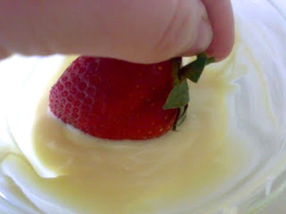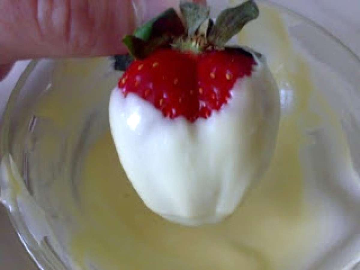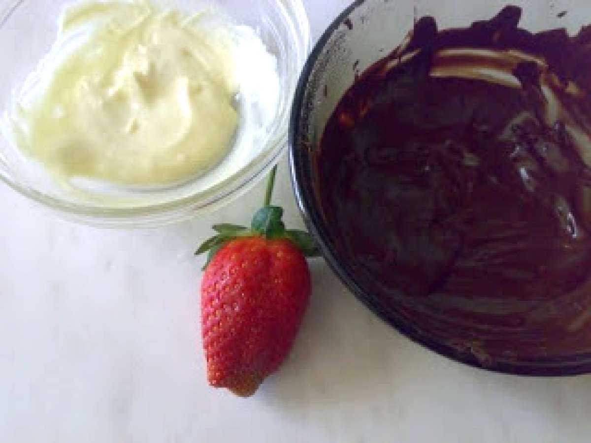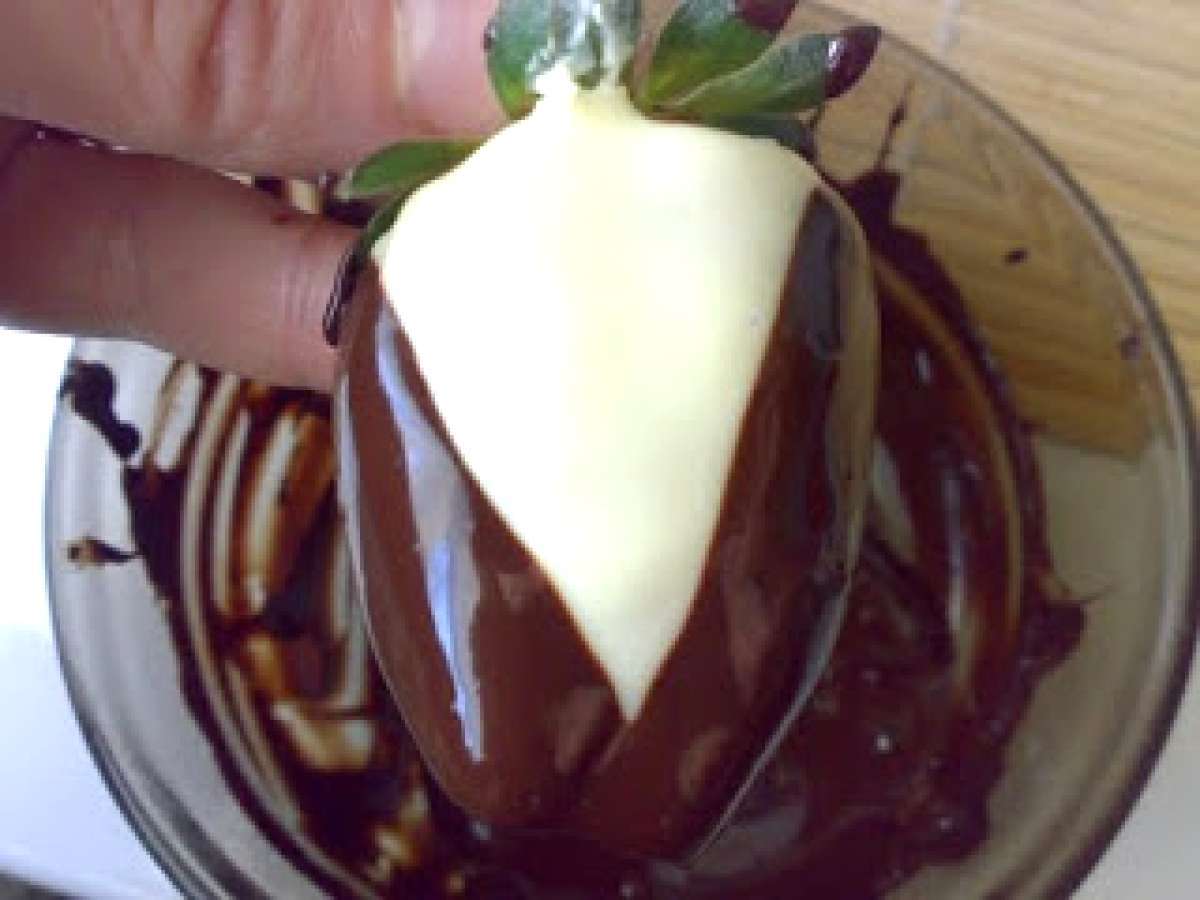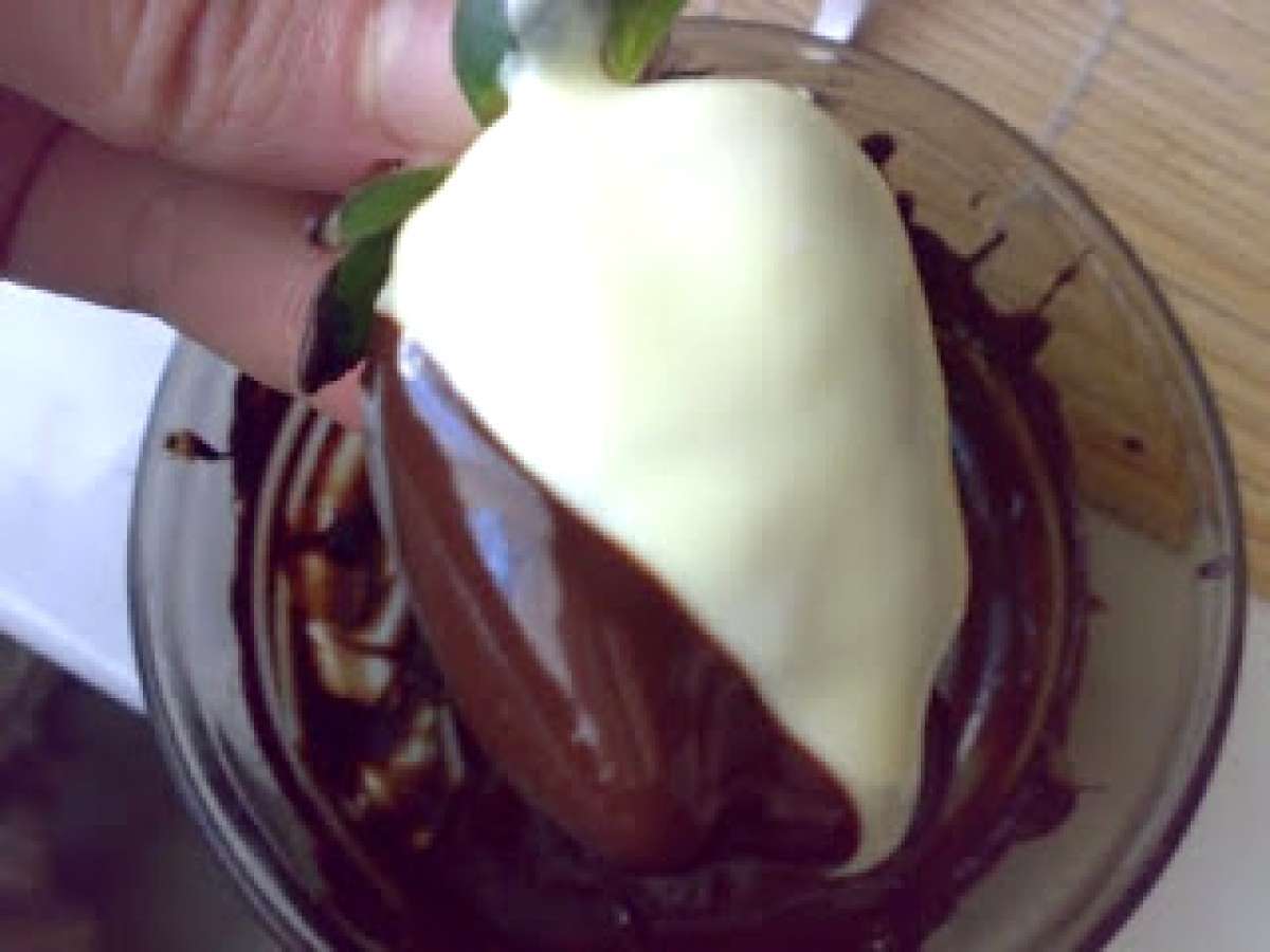 Decoracion de fresas para pastel/torta de novios AnteriorSiguiente PostreFácil15 min Enviar esta receta a un amigo Imprimir esta página Preguntar al autor Publicar la foto de esta receta Ingredientes 1 2 grandes fresas/frutillas frescas La mitad de 1 barra de chocolate negro para postres Nestle 1 cuchararda sopera de crema liquida/nata liquida la mitad de 1 cucharadita pequeña de mantequilla La mitad de 1 barra de chocolate blanco 1 cuchararda sopera de crema liquida/nata liquida la mitad de 1 cucharadita pequeña de mantequilla