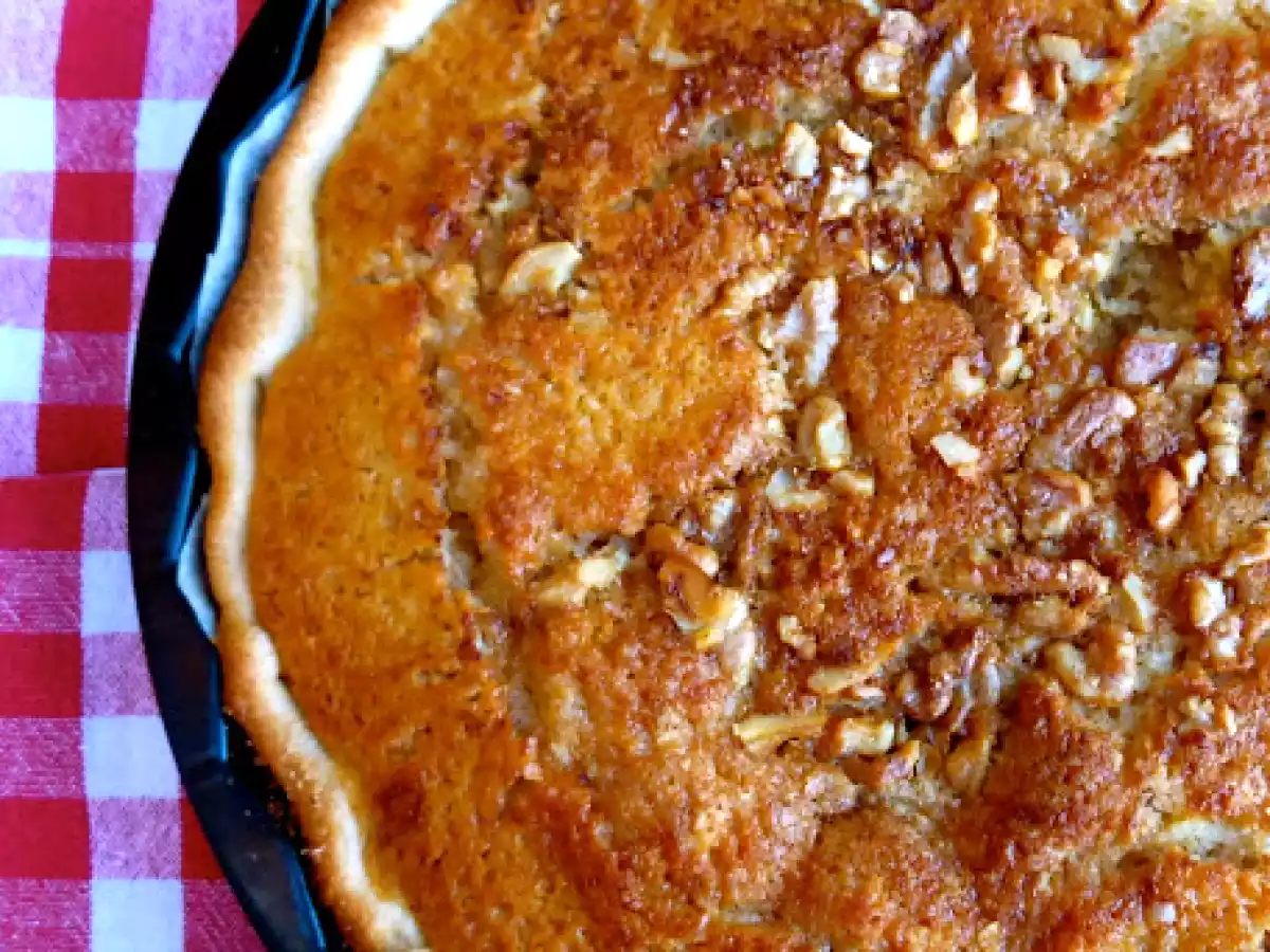 Shoofly pie, o tarta a la melaza de los amish. AnteriorSiguiente PostreFácil1 hora510 Kcal Enviar esta receta a un amigo Imprimir esta página Preguntar al autor Publicar la foto de esta receta Ingredientes 6 Para el crumble: 200 g de harina 100 g de azúcar 100 g de azúcar moreno 100 g de mantequilla fría cortada en dados Para la tarta: 1 base de pasta quebrada refrigerada 1 huevo mediano 200 ml de agua tibia 120 ml de melaza, o jarabe de arce 1 cucharadita de levadura química 1 puñadito de nueces troceadas groseramente