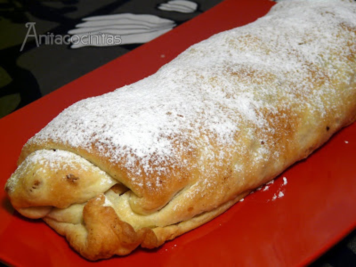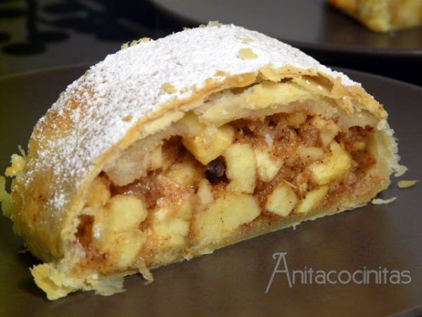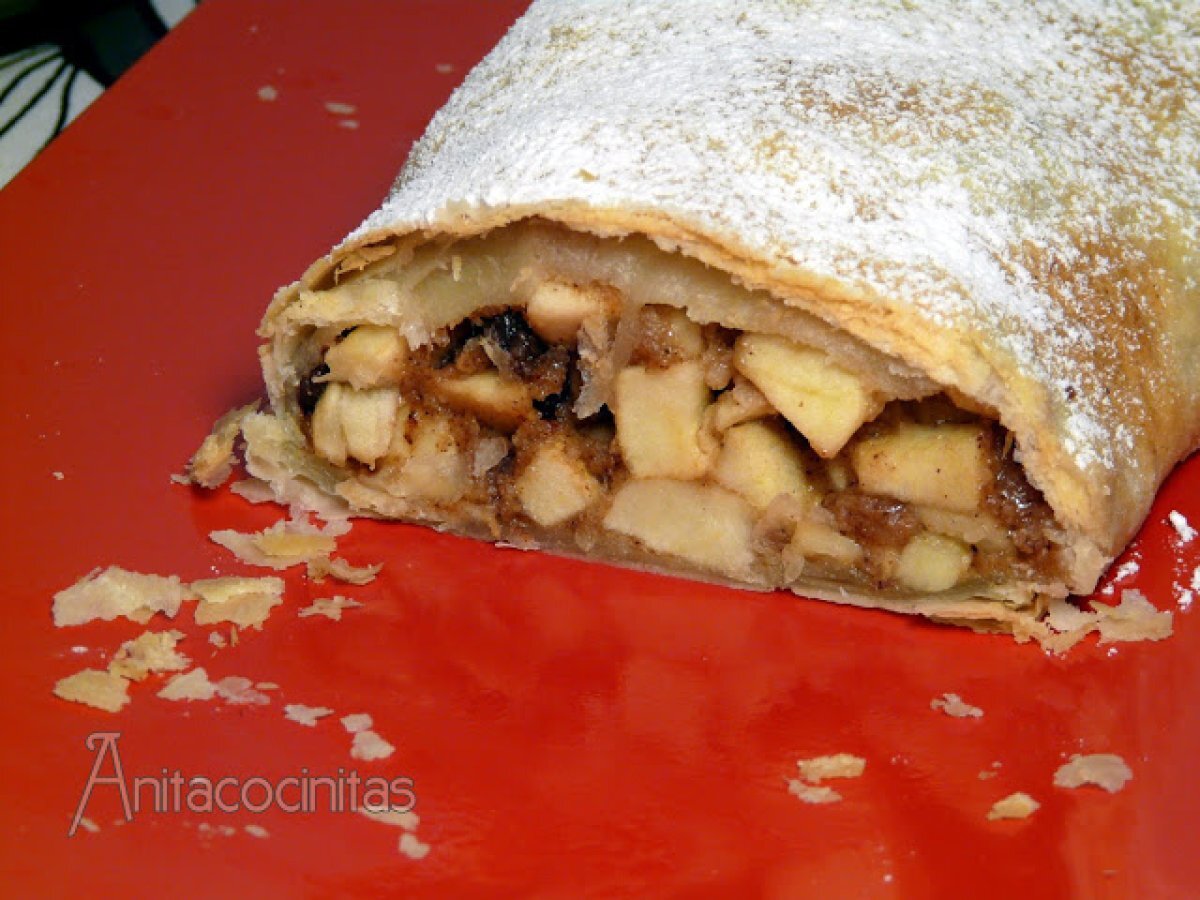 Strudel de manzana AnteriorSiguiente PostreFácil40 min274 Kcal Enviar esta receta a un amigo Imprimir esta página Preguntar al autor Publicar la foto de esta receta Ingredientes 4 1 masa para Strudel: masa filo 500 gr de manzanas peladas y despepitadas. El libro recomienda de la variedad Cox. 30 gr de pasas 30 gr de azúcar 30 gr de pan rallado 30 gr de mantequilla 1 cucharada de canela en polvo un podo de mantequilla para pintar la superficie azúcar glasé Costo estimado: 2.19Euros€ (0.55€/porción)