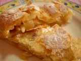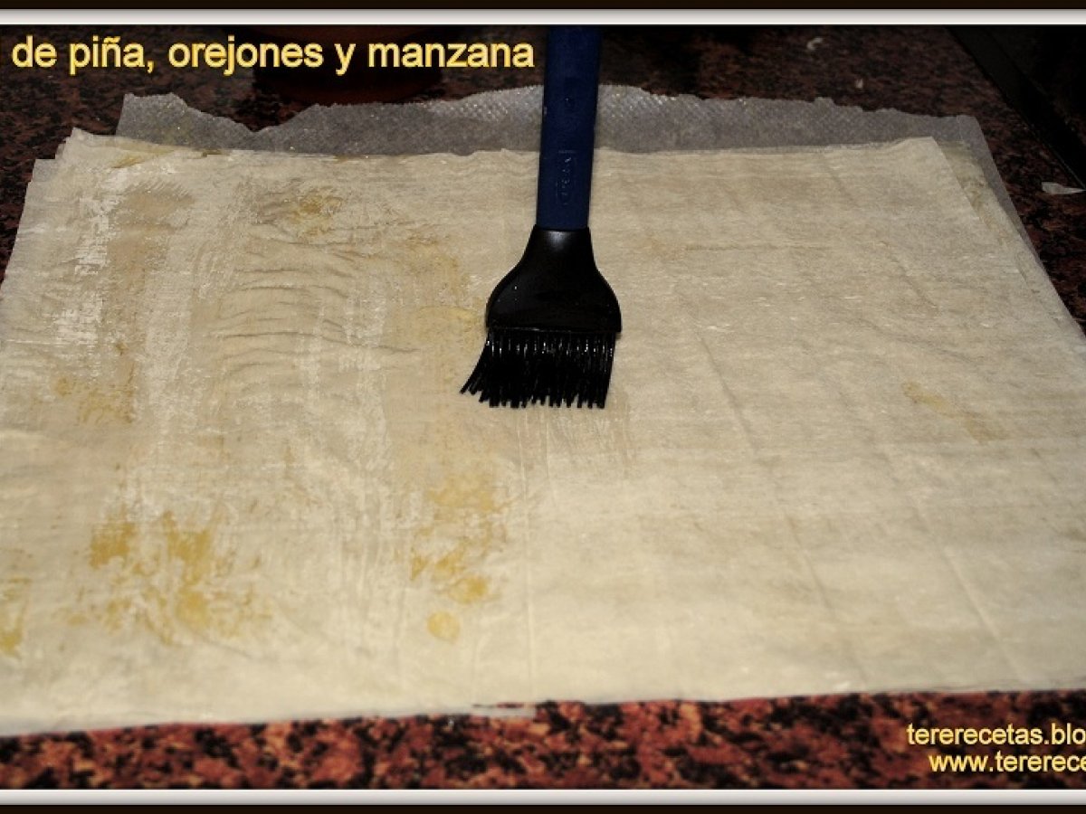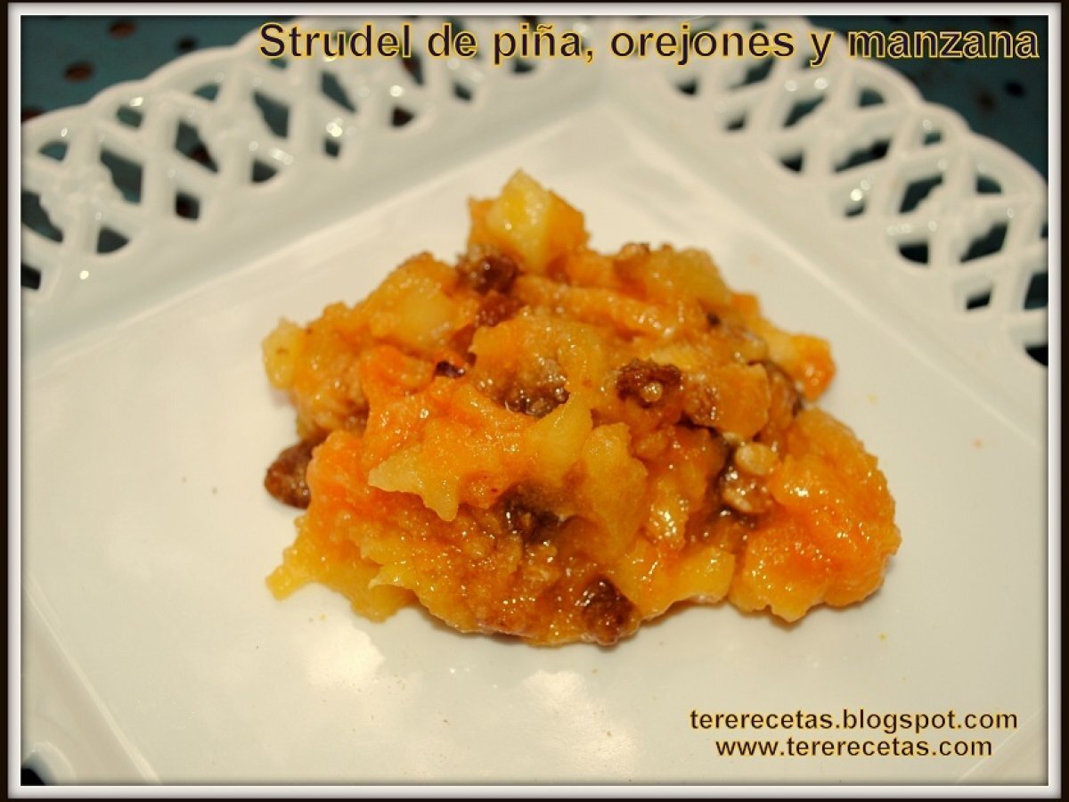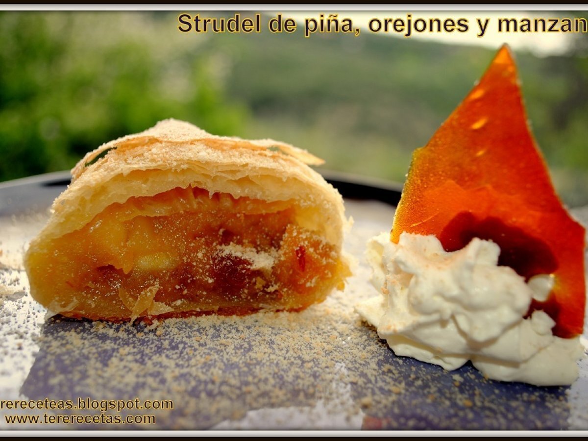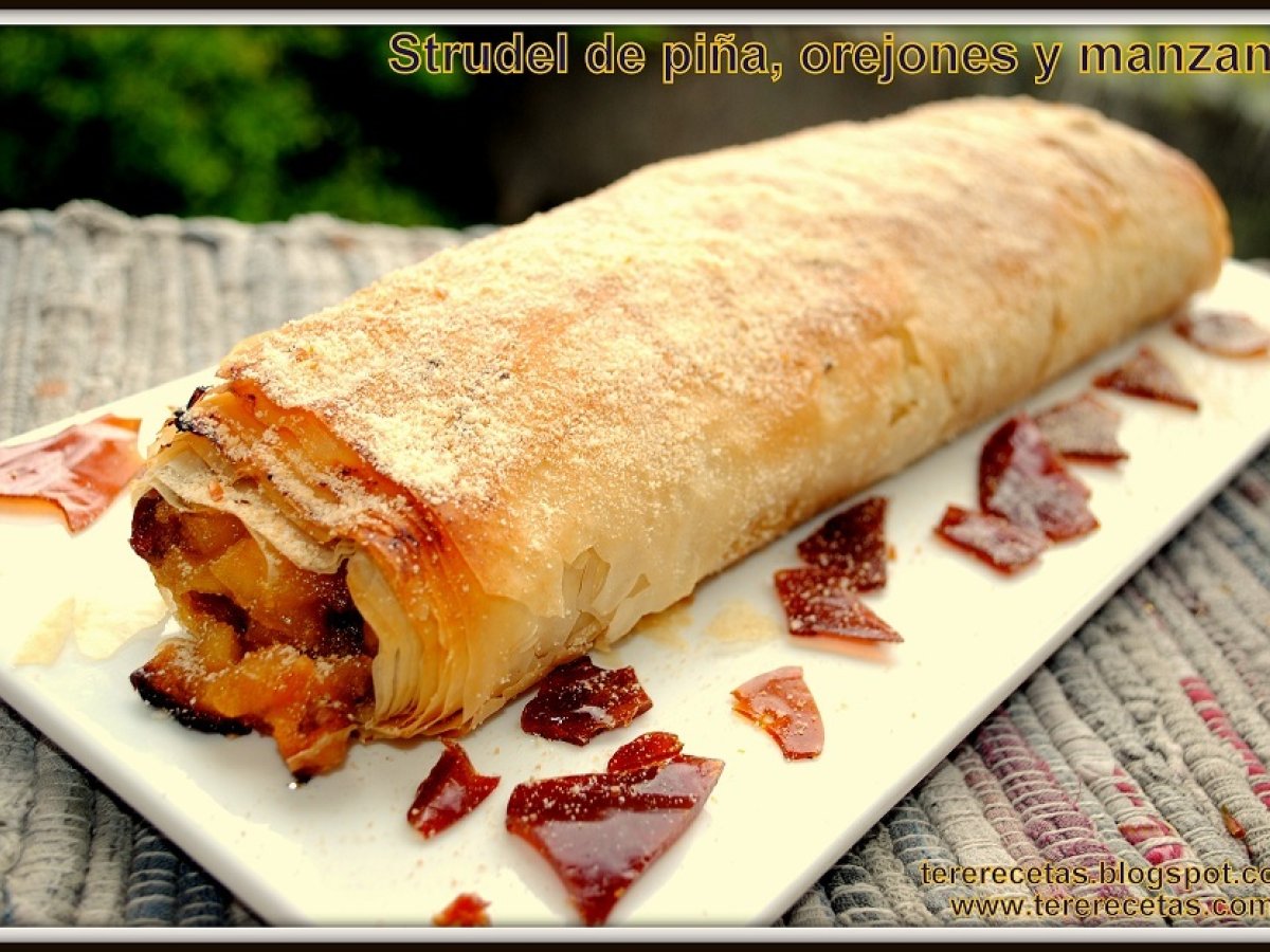 Hola a todos... Hoy quería hacer un strudel para llevar a casa de unos amigos pero que no fuera el típico de manzanas, así que me aventuré en mezclar orejones, piña y manzana y el resultado ha sido delicioso..claro el sabor predominante es el de los orejones de albaricoque y las piñas pero la manzana le aporta consistencia...Hice el doble de las cantidades, salieron dos strudel y menos mal porque no quedaron ni las migas.