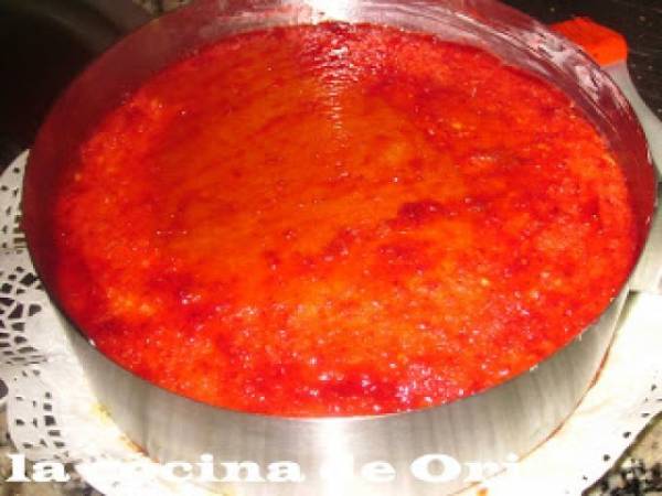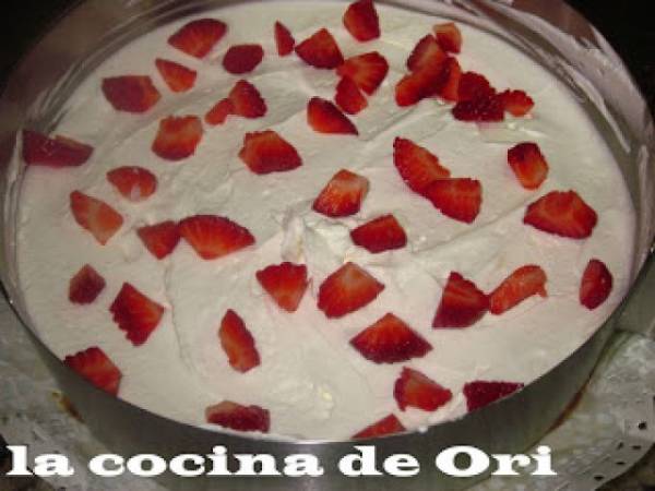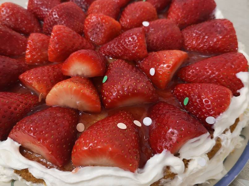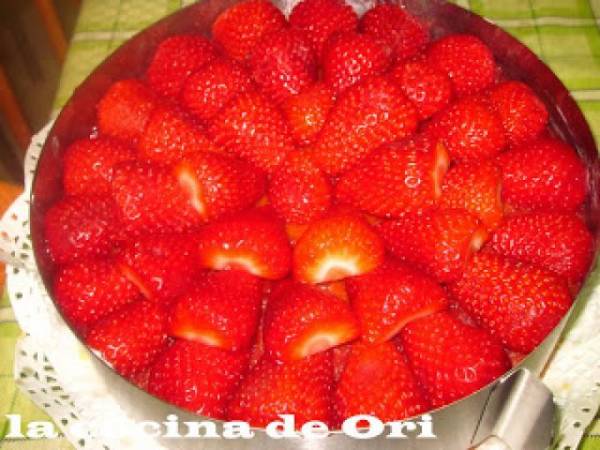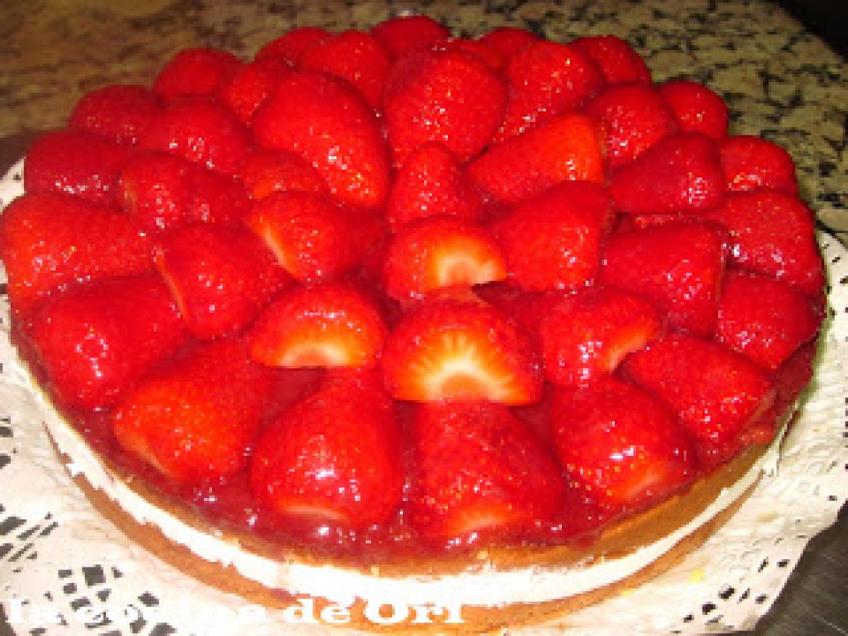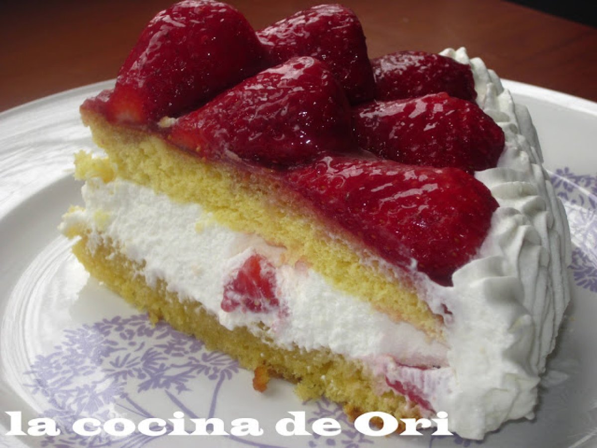 Tarta de fresas con nata AnteriorSiguiente PostreFácil50 min689 Kcal Enviar esta receta a un amigo Imprimir esta página Preguntar al autor Publicar la foto de esta receta Ingredientes 4 Bizcocho genovés: 4 huevos 125 gr de azúcar 125 gr de harina de repostería Para el almíbar de mojar el bizcocho: 1/2 vaso de ron añejo 1 vaso de agua 4 cucharadas de azúcar Para el relleno y cobertura: 700 gr de nata la asturiana 35% M.G 150 gr de azúcar glass 750 gr de fresones hermosos mermelada de fresa 3 hojas de gelatina neutra Costo estimado: 12.18Euros€ (3.04€/porción)
