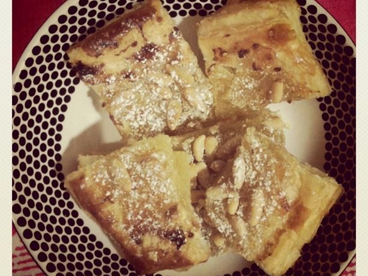 Tarta de hojaldre con cabello de ángel y piñones AnteriorSiguiente PostreDifícil2 h 25 m1172 Kcal Enviar esta receta a un amigo Imprimir esta página Preguntar al autor Publicar la foto de esta receta Ingredientes 2 Ingredientes: 300 gr de harina de media fuerza 175 cc de agua fría 25 gr de mantequilla 5 gr de sal 200 gr de mantequilla o margarina especial para hojaldre (fría)* Costo estimado: 3.2Euros€ (1.6€/porción)