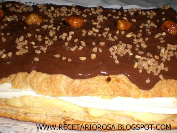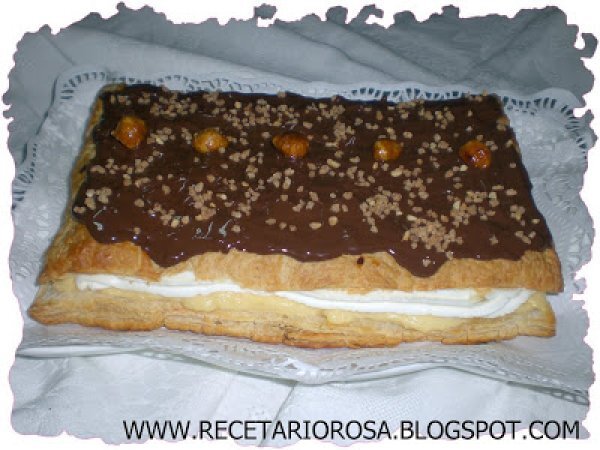Tarta de hojaldre rellena de crema y nata AnteriorSiguiente PostreFácil1 hora Enviar esta receta a un amigo Imprimir esta página Preguntar al autor Publicar la foto de esta receta Un buen postre con una buena decoración. Ingredientes 4 1 placa de hojaldre congelada 300 ml. de nata para montar Para la crema pastelera: ½ l de leche 50 g De harina 120 g De azúcar Corteza de 1 limón 2 huevos Para decorar: 100 ml de nata 150 g de chocolate Nestlé postres almendras picadas
