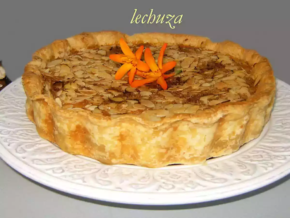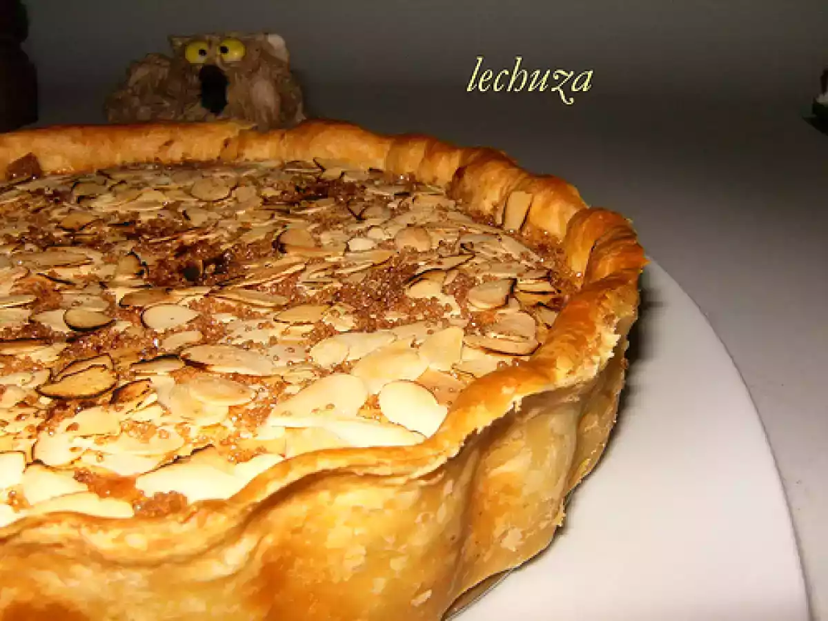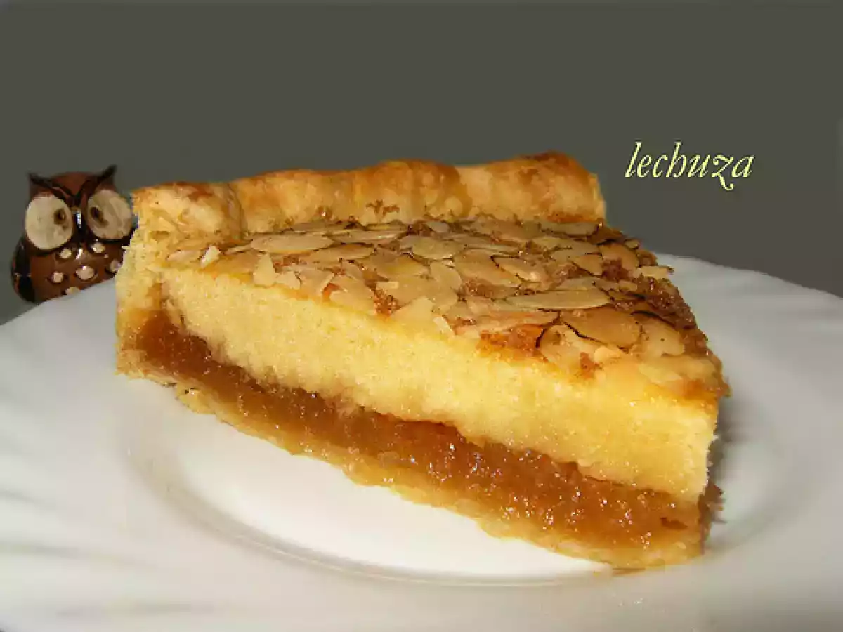 Tarta de manzana y almendras - bakewell tart AnteriorSiguiente PostreFácil45 min746 Kcal Enviar esta receta a un amigo Imprimir esta página Preguntar al autor Publicar la foto de esta receta Ingredientes 6 200 g harina de trigo 100 g de mantequilla 1 pizca de sal 1 huevo entero 25 g de azúcar 1 cucharada de agua fría 6 cucharadas colmadas de mermelada de manzana o cualquier otra 125 g de almendras molidas 125 g de mantequilla fundida 125 g de azúcar glass 30 g de harina 3 huevos 1 cucharada de almendra fileteada 1 cucharada de azúcar moreno Costo estimado: 5.84Euros€ (0.97€/porción)