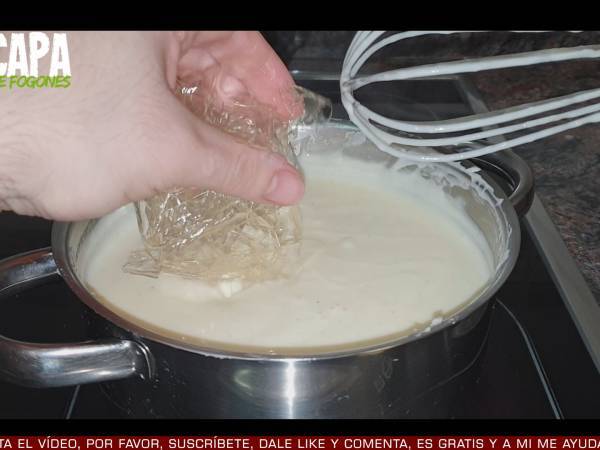 Una vez que están todos los ingredientes bien integrados, incorporamos las láminas de gelatina bien escurridas y removemos hasta que se derritan.