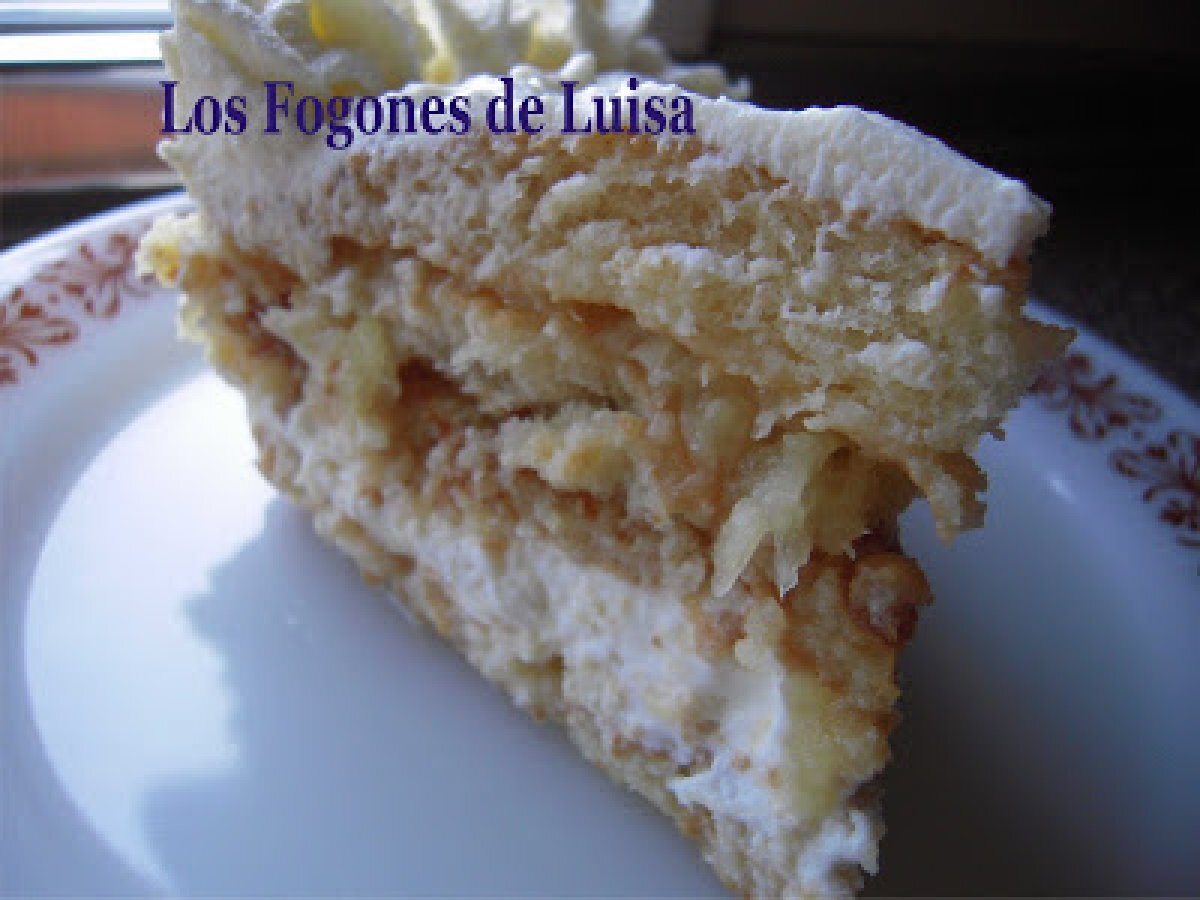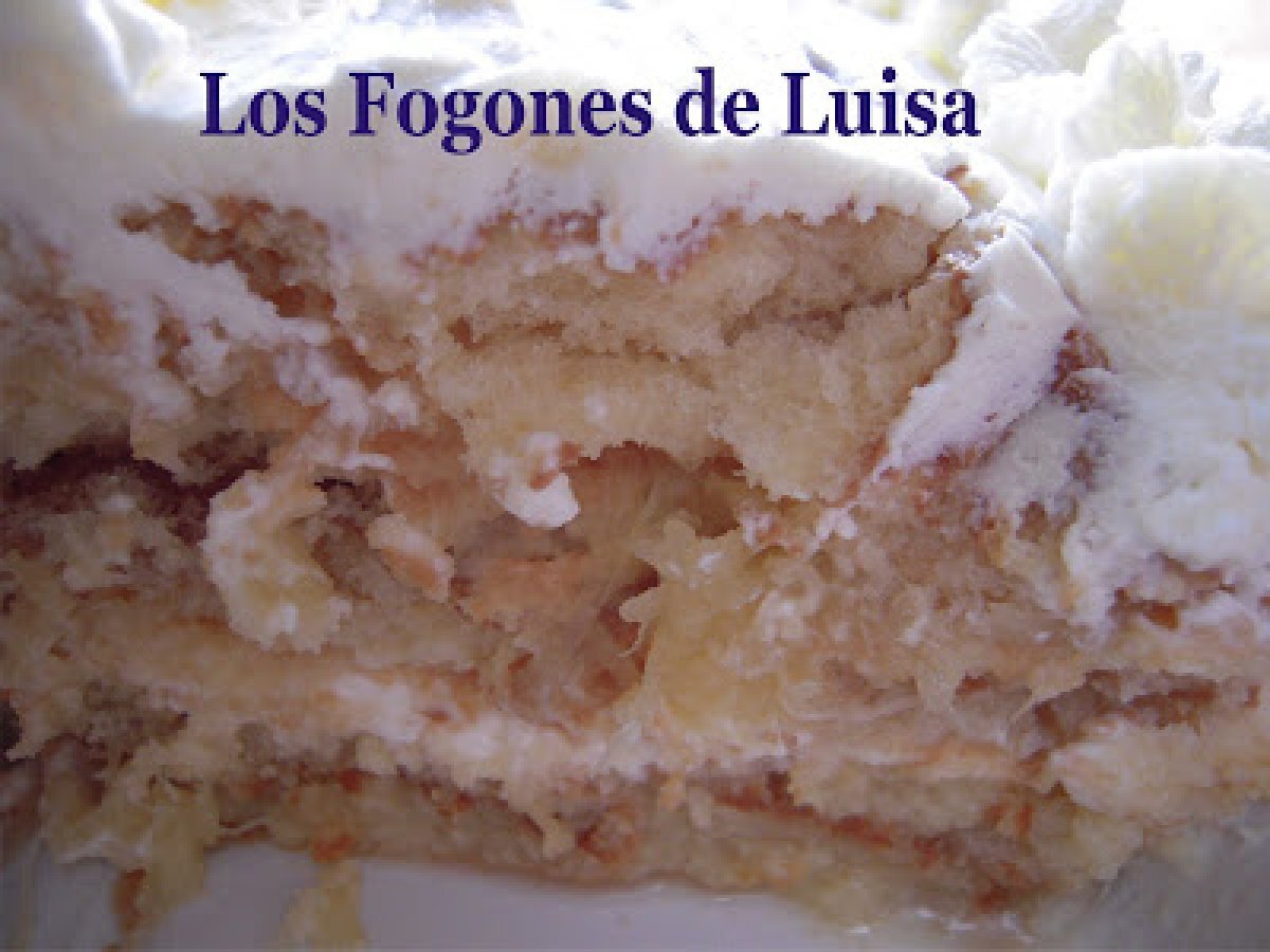 Tarta fría de piña, sin horno AnteriorSiguiente PostreFácil35 min Enviar esta receta a un amigo Imprimir esta página Preguntar al autor Publicar la foto de esta receta Ingredientes 2 2 botes de piña en almíbar 1 terrina de queso tipo Philadelfia de 300 gms 2 paquetes de soletillas (de las blanditas) 1/2 kg de nata de montar