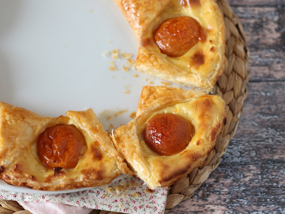 Lavar los albaricoques, secarlos y cortarlos por la mitad. Colocar las 8 mitades de albaricoque alrededor del hojaldre, sobre la crema pastelera. - Ahora pliega los triángulos que hemos cortado, llevando cada pico hacia el extremo del hojaldre. Presionar ligeramente para sellar el pico con el borde, de modo que al inflarse durante el horneado, no se despeguen.