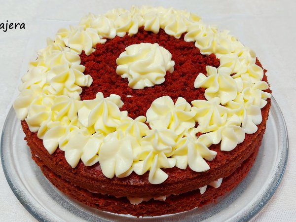 Cubrimos una de las planchas con frosting de queso y superponemos la otra plancha de bizcocho. - Cubrimos toda la tarta con frosting tanto por encima como por los laterales y dejamos enfriar media hora en la nevera.