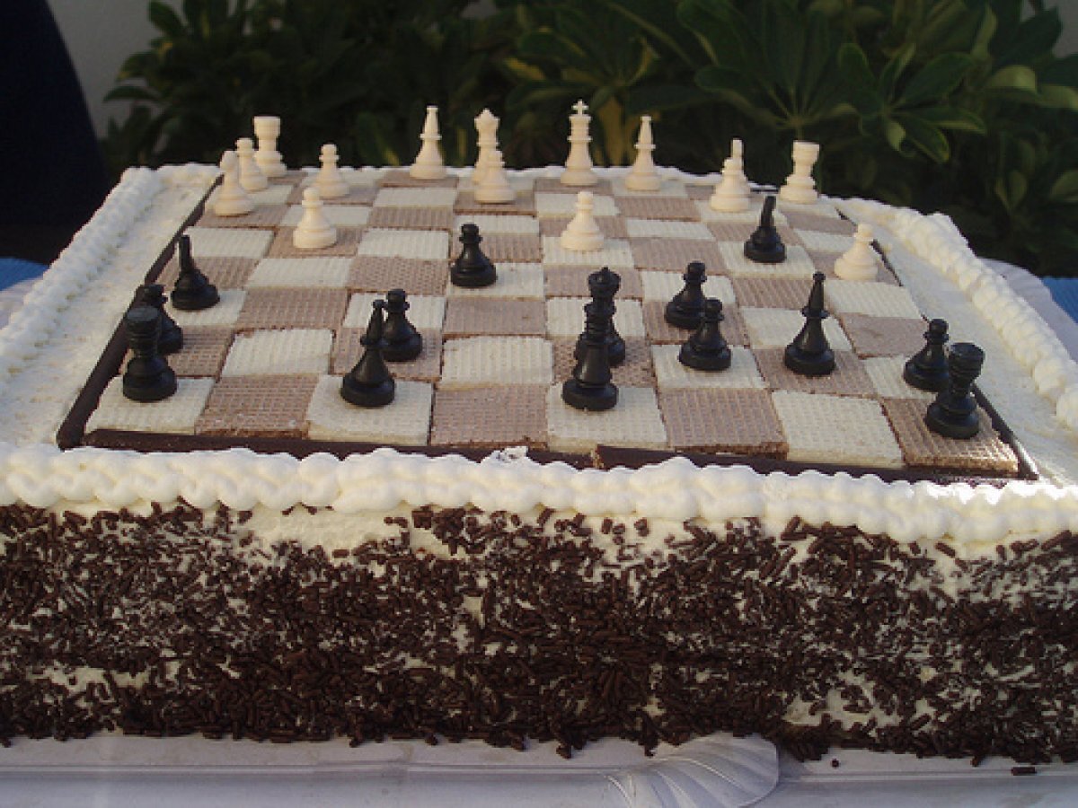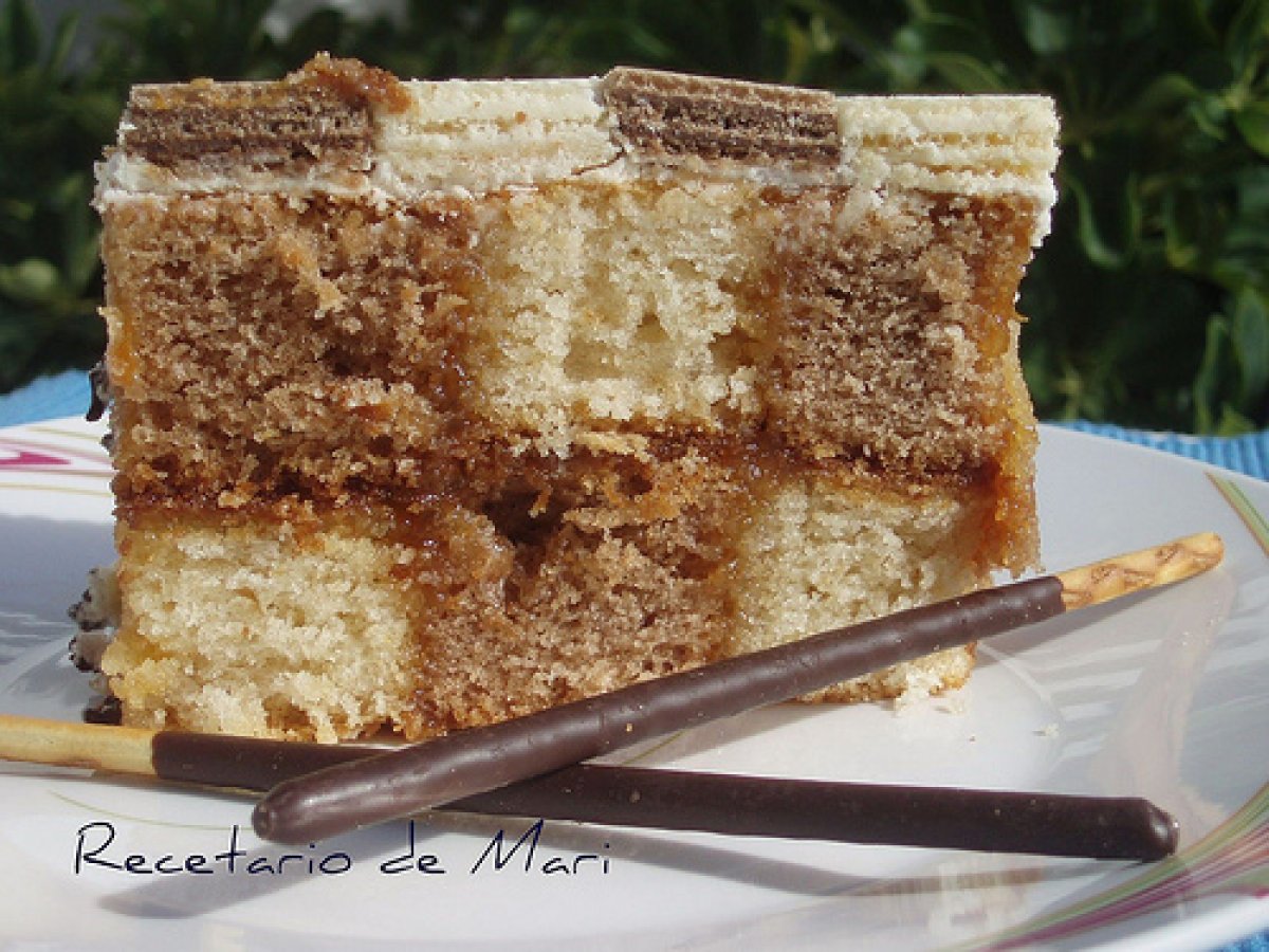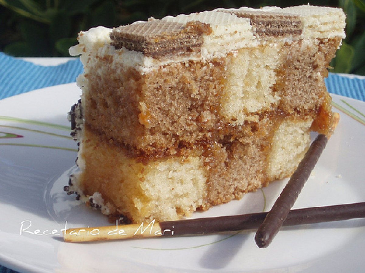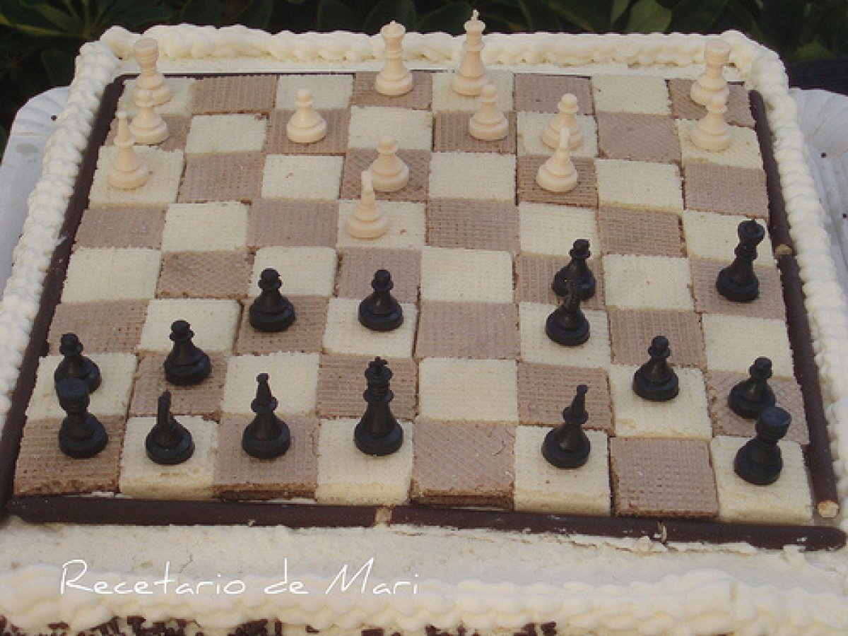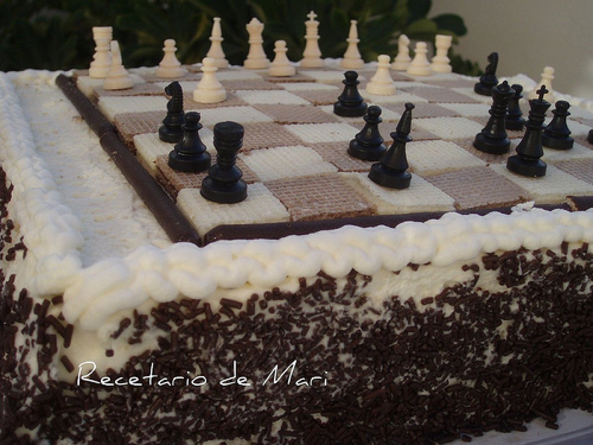 Tarta tablero de ajedrez y feliz cumpleaños AnteriorSiguiente PostreMedio55 min744 Kcal Enviar esta receta a un amigo Imprimir esta página Preguntar al autor Publicar la foto de esta receta Ingredientes 6 Para del bizcocho : 7 tacitas de leche 5 tacitas de azúcar 4 tacitas de aceite de girasol 2 sobres de levadura química (32 g) 500 g de harina de trigo Ralladura de 1 limón esencia de vainilla (una cuharada) mermelada de albaricoque 2 cucharadas de cacao Para la decoración y cobertura : 250 g de nata 1 tableta de chocolate blanco 1 paquete de barquillos de vainilla 1 paquete de barquillos de chocolate granillo de chocolate unos palitos de mikado