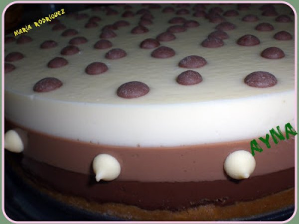 Tarta tres chocolates(thermomix y forma tradicional) ii AnteriorSiguiente PostreFácil35 min Enviar esta receta a un amigo Imprimir esta página Preguntar al autor Publicar la foto de esta receta Ingredientes 6 200 g de chocolate puro. 200 g de chocolate con leche con almendras. 200 g de chocolate blanco. 3 sobres de cuajada. 750 g de nata para montar (la tendremos un mínimo de 24 h. en la nevera). 750 g de leche entera. 150 g de azúcar. 1 molde desmontable.
