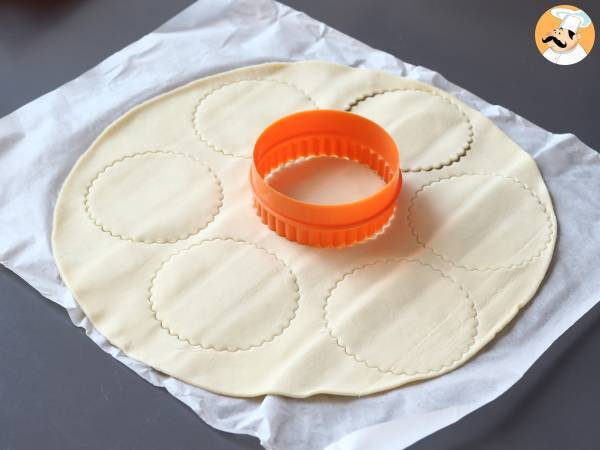 Nosotros hemos optado por hojaldre redondo y hemos recortado círculos en el interior. También puedes utilizar hojaldre rectangular y cortar 6 rectángulos de hojaldre.