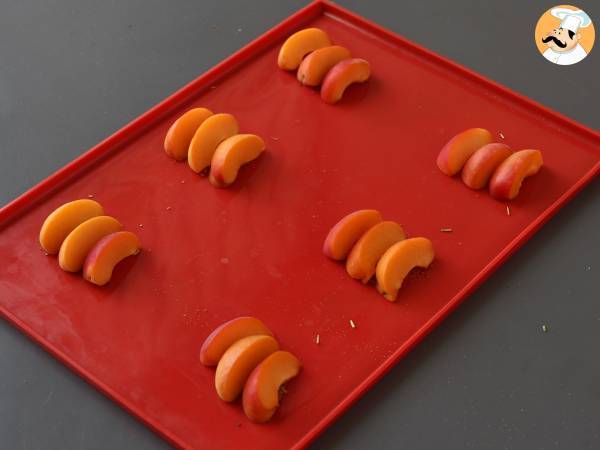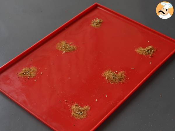 Agregar una pequeña cantidad de azúcar en una bandeja de horno de silicona o forrada con papel de horno. Añadir una pizca de romero por encima.