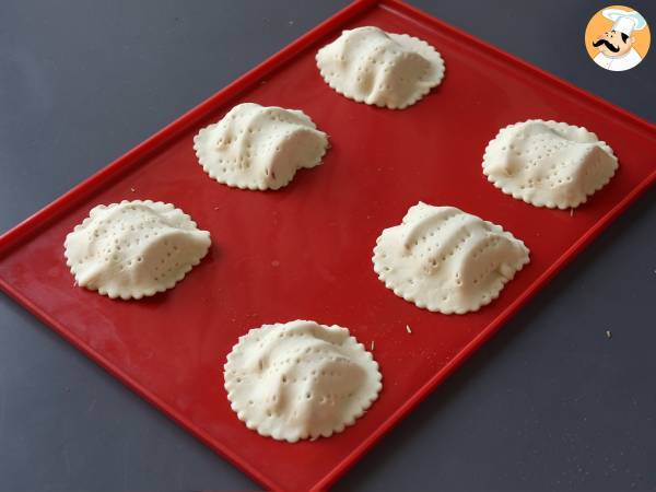A continuación, colocar un círculo de masa encima y pinchar la superficie con un tenedor para evitar que se hinche durante el horneado.