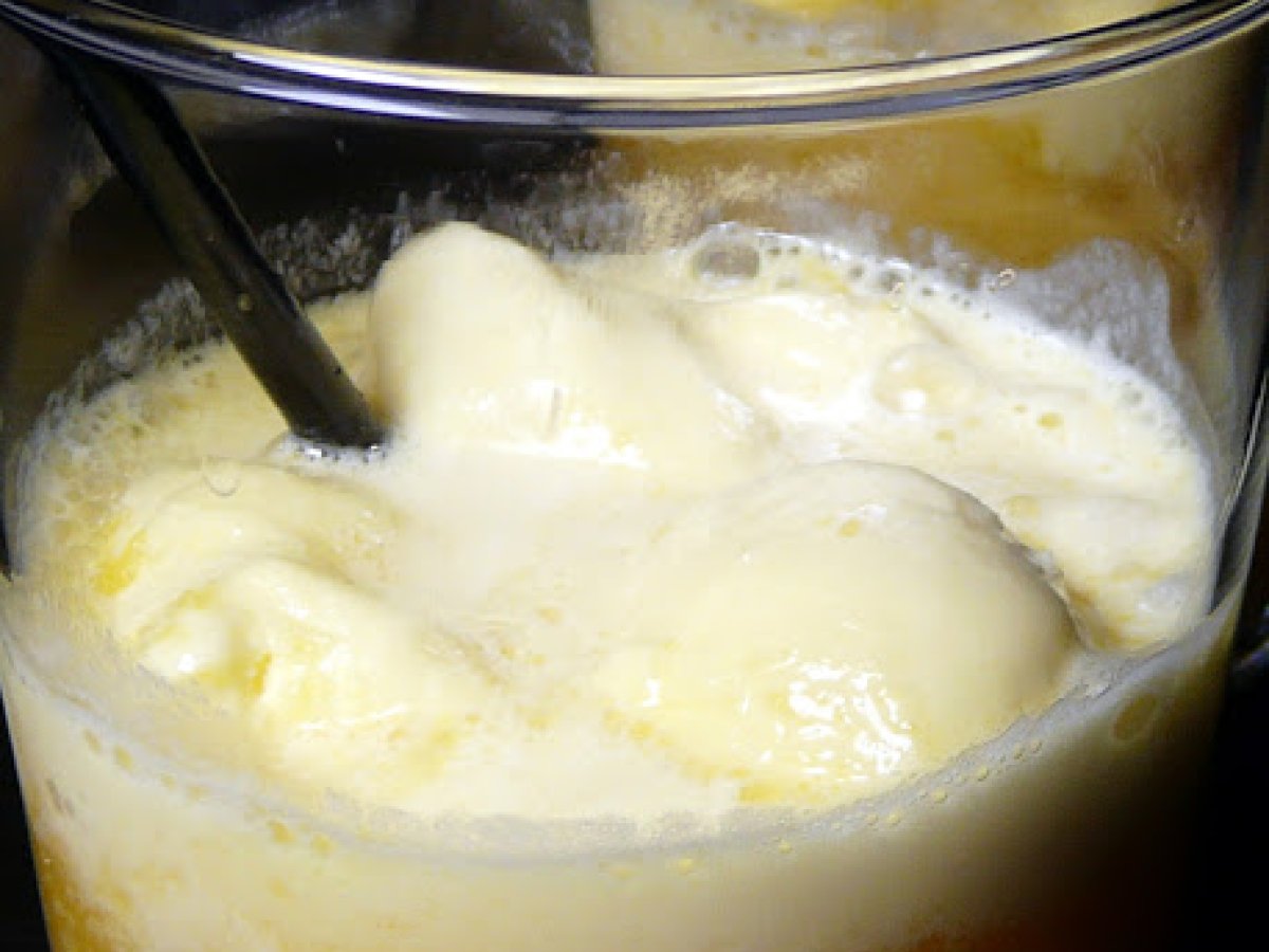 - Ponemos el helado en un vaso grande y añadimos el zumo de naranja. Natural, por supuesto.