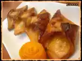Ingredientes: 2 berenjenas 4 rodajas de queso de cabra Cebolla caramelizada Harina de tempura santa rita salsa de módena Miel Alguna fruta para acompañar