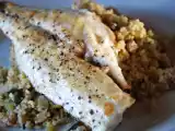 Ingredientes: 1 dorada 1 vasito de cuscús 1/2 pimiento verde 1/2 calabacín Cilantro en polvo Garam Masala en polvo Pimienta y sal 1 cebolla 1 rodaja de limón
