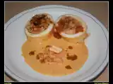 Ingredientes: Un calamar gigante o 4 medianos Dos cebollas grandes Dos pimientos Tomate frito Un brik de nata liquida 200 g de gambas 300 g de carne de