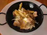 Ingredientes: 1 paquete 200 g de gulas 200 g de gambas peladas 1 patata grande cortada finas y alargadas 3 huevos fritos 2 dientes de ajos laminados 2 cucharas...