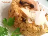 Ingredientes: 300 g de arroz arborio 100 g de mejillones (sin concha) 100 g de gambas. 1 Puerro. 1 Cebolleta. 1 Cucharada de pimenton dulce. 75 g de queso...