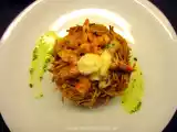 Ingredientes: 500 grs de fideos del nª 2 12 gambas rojas 3 dientes de ajo 1 cebolla (a poder ser blanca o de Figueres) 2 tomates maduros 1 vasito de vino blanco...