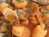 Ingredientes: 1kg. de langostinos 1/2 de almejas 8 cucharadas de aceite de oliva 4 ajos 1 vaso de tomate frito (vaso pequeño) 1 vaso de vino blanco (vaso...
