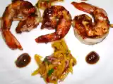 Ingredientes: 12 langostinos 1/2 taza de pasta de tamarindo 1 mango maduro pero firme 1 cebolla morada ¼ de taza de albahaca fresca 1 cucharada de vinagre...