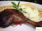 Ingredientes: 2 muslos de pato frescos Sal Pimienta blanca molida Azúcar Aove Un vaso de vino blanco 4 cucharadas de miel 4 hojas de salvia fresca Puré de...
