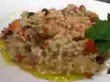 Ingredientes: 250gr arroz integral (para dos personas) Cebolla (media) Pimiento rojo (media) Seis nueces peldas 100gr de pasas sultanas Medio vaso de cava seco...