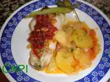Ingredientes: 1 merluza del tamaño que necesitemos patatas, cebollas y tomate pimiento asado, jamón en tacos y piñones ajos piemento negro sal vino blanco...