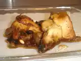 Ingredientes: 4 rodajas de salmón 1 cebolla grandota 3 dientes de ajo 50 g de piñones 50 g de pasas 1 vaso de vino dulce 250 ml de leche evaporada perejil