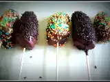 Ingredientes: 4 platanos 125 g de chocolate de cobertura entre 40 y 50 g de mantequilla virutas de chocolate y de colores palitos para helado o para brochetas