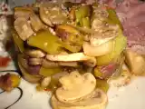 Ingredientes: 8 puerros 150 g de champiñones en laminas 200 ml de vino de Malaga 3 c.soupe de miel liquida sal pimienta pistachos sin sal parmesano rallado