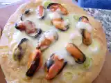Ingredientes: 250 g de masa 2 puerros que cortamos en rodajitas de 2-3 mm aceite de oliva virgen 1 kg de mejillones 50 g gruyere rallado 60 g de mozzarella (1/2...