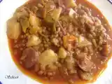 Ingredientes: 100 g de lentejas 1 pimiento rojo pequeño 1 pimiento verde pequeño 3 dientes de ajo 2 patatas grandes 1 zanahoria 1 tomate grande 1 chorizo...