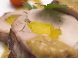 Ingredientes: · 1 Solomillo de cerdo · 1 Mango · 2 dientes de ajo · 1 puerro · 2 chalotas · 1 vaso de vino Oporto blanco · Aceite de oliva · Sal y pimienta