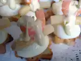 Ingredientes: 6 Huevos 12 Gambas ó Langostinos 12 puntas de Espárrago blanco 12 Aceitunas rellenas de Anchoa 12 rebanadas de pan tostado Mayonesa Casera 12...