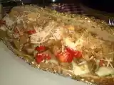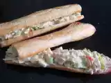 Ingredientes: 1 barra de pan (blandita de media cocción) 1 lata de atún 2 barritas de cangrejo (surimi, txaka) 2 huevos 1 tomate 3 pimientos del piquillo lechuga...