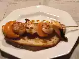 Brocheta de atún con langostinos acompañada de su salsa casera de pimientos fritos.